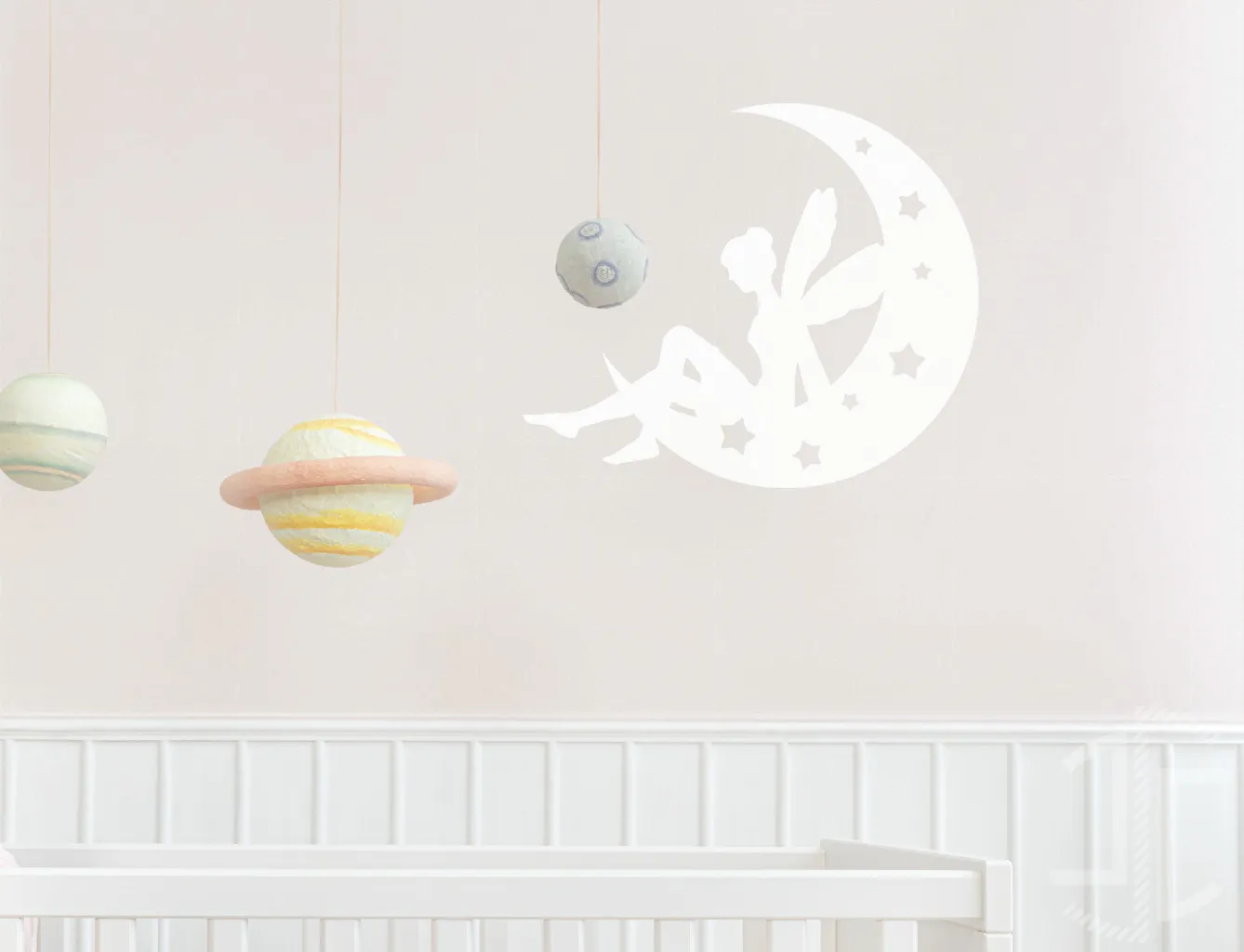 Este autocolante em vinil, intitulado "A Fada e a Lua", evoca um ambiente de sonho e fantasia, ideal para decorar quartos infantis ou espaços que pretendam transmitir uma sensação de calma e magia. O design apresenta uma silhueta delicada de uma fada, com asas etéreas, sentada graciosamente sobre uma lua crescente adornada com estrelas. A paleta de cores neutras, com o vinil em tom claro sobre um fundo suavemente rosado, contribui para a atmosfera serena e acolhedora da composição.