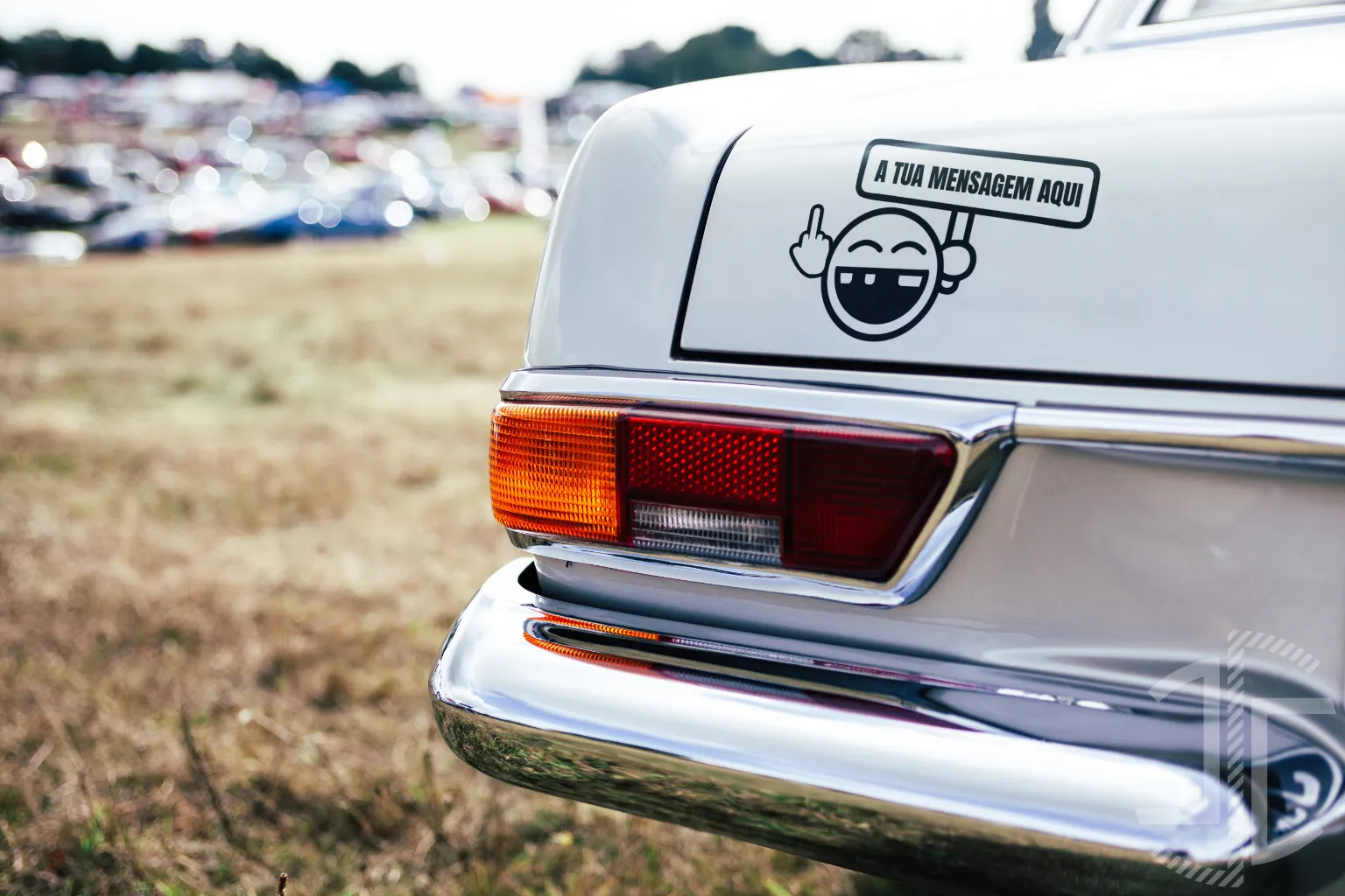 Acompanhando esta figura, uma placa retangular, empunhada pela outra mão do smiley, ostenta a inscrição "A TUA MENSAGEM AQUI". Este elemento interativo convida o utilizador a personalizar o seu vinil, transformando o decalque numa plataforma para a sua própria declaração, seja ela de humor, descontentamento ou qualquer outra expressão que deseje amplificar através da figura irónica. Esta característica potencia a natureza subversiva do design, permitindo que a irreverência se adapte e ressoe com a voz individual do proprietário.