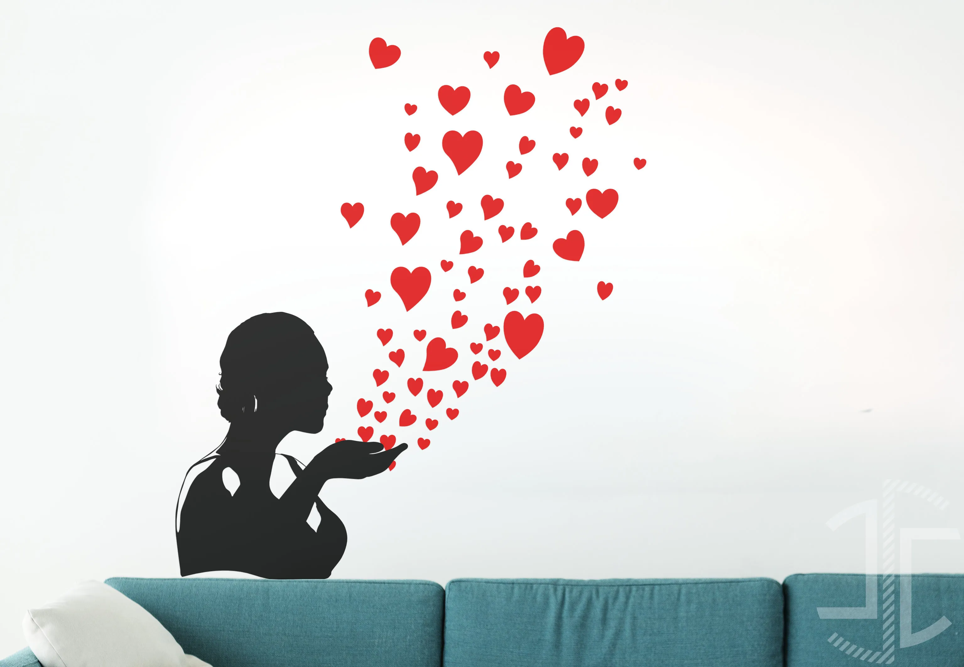 Num gesto de uma simplicidade desarmante, uma silhueta feminina sopra um beijo ao vento, e este transforma-se numa cascata de corações vermelhos que se espalham pelo ar. Este autocolante decorativo é uma metáfora visual sobre a natureza do amor e da generosidade. Não é o amor que se possui, mas o amor que se dá. É a representação da ideia de que o afeto, quando partilhado livremente, multiplica-se e preenche o espaço à sua volta, criando beleza a partir do nada.