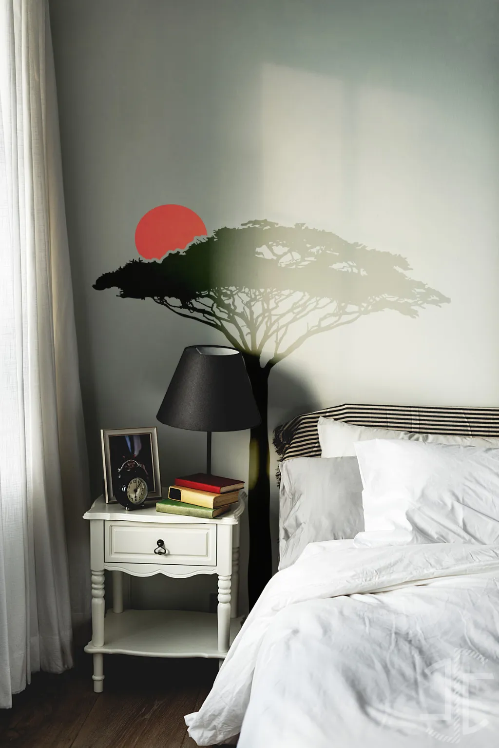 A interação entre estas duas formas cria uma narrativa visual silenciosa. É um design que evoca uma certa nostalgia por um lugar que talvez nunca tenhamos visitado, mas que reconhecemos a um nível primordial. É importante notar que, na escolha do material, a cor selecionada aplica-se exclusivamente à silhueta da acácia, permitindo a sua integração cromática no ambiente. O sol, contudo, permanece invariavelmente em vermelho, fiel ao seu papel de astro-rei no crepúsculo.