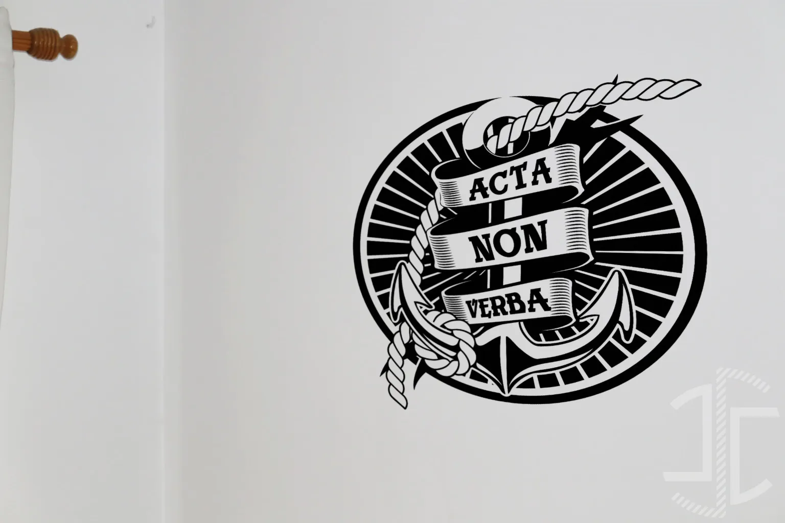 No coração de tudo, o lema: "Acta Non Verba". Atos, não palavras. É um código de conduta, uma filosofia de vida destilada em três palavras que carrega o peso de uma verdade universal. No contexto marítimo, esta máxima adquire uma urgência literal. No mar, as promessas são levadas pelo vento; a sobrevivência depende da ação precisa, do nó bem dado, da manobra executada a tempo. Não há espaço para retórica quando a tempestade se aproxima. Este autocolante é, por isso, mais do que uma imagem decorativa. É um lembrar silencioso e constante de que o carácter se mede pelo que se faz, não pelo que se diz. Uma declaração de integridade para navegadores, marinheiros e todos aqueles que acreditam que a realidade se constrói com as mãos...