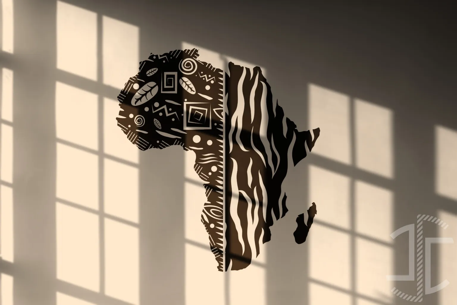 Em contraponto direto, o lado direito do mapa é dominado por um padrão animal, cujas riscas fluidas e irregulares remetem inequivocamente para a pele de uma zebra. Esta escolha representa o fascínio global pela fauna africana e pelas suas vastas paisagens naturais. As formas são orgânicas, dinâmicas e invocam a savana, o movimento e a força primordial da vida selvagem. Esta metade é a África do imaginário documental, um santuário de biodiversidade que existe em paralelo com a sua faceta humana.