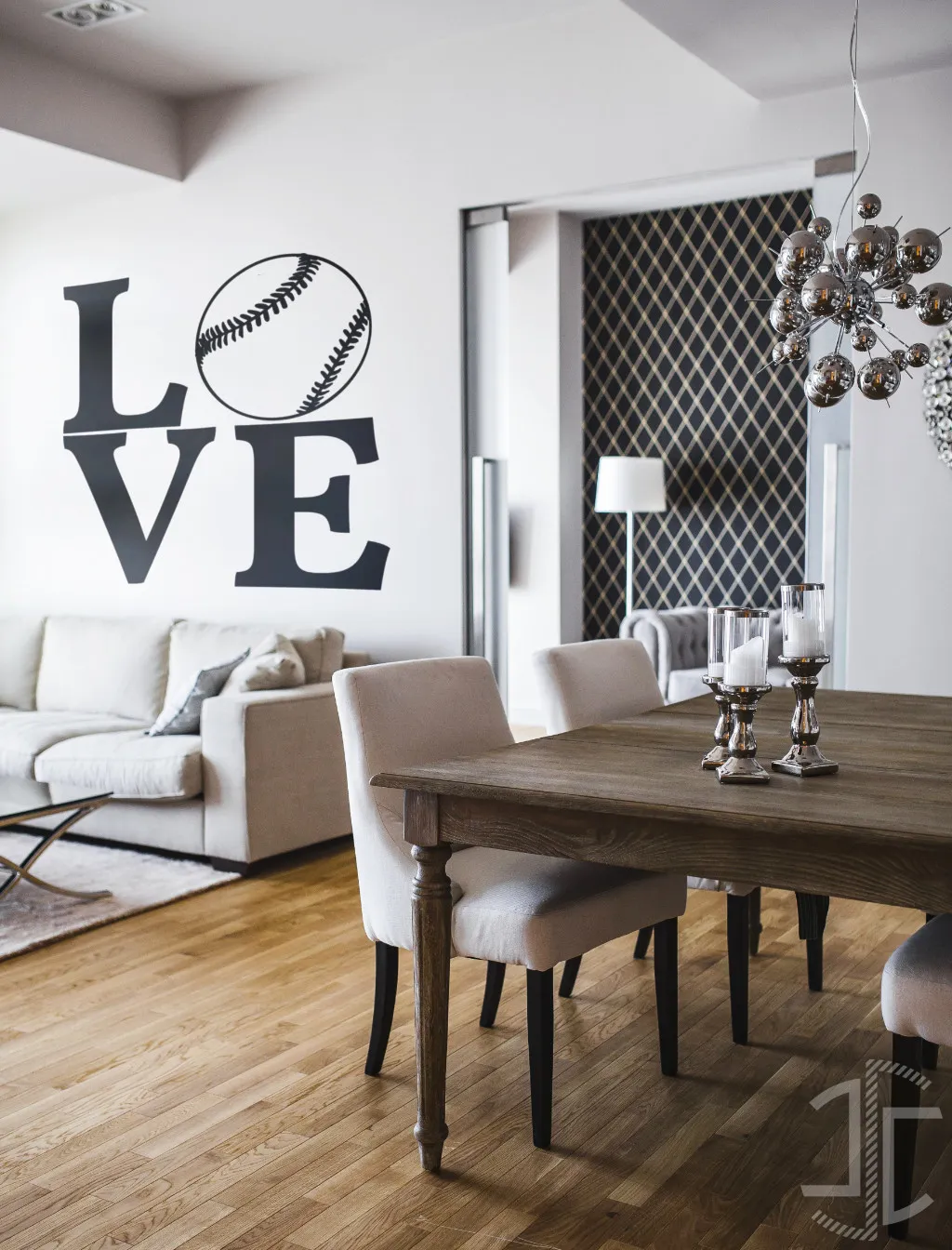O epicentro visual da peça é a substituição da letra “O” pela representação gráfica de uma bola de basebol. O seu desenho, de linha limpa e focada no detalhe da costura, funciona como o coração pulsante da composição. É um ícone universalmente reconhecido que quebra a rigidez da tipografia, inserindo o elemento de paixão e de jogo no centro da palavra. A escolha do preto (ou branco), intemporal e assertivo, garante um contraste máximo em qualquer superfície, transformando uma parede num altar discreto à cultura e à estética de um dos desportos mais icónicos do mundo.