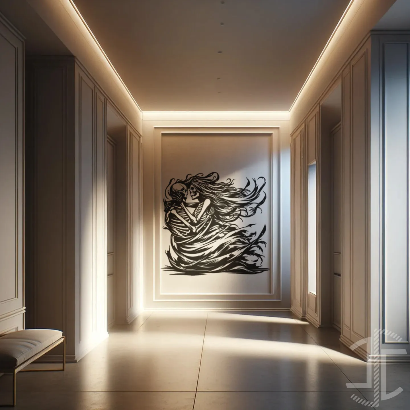 Esta imagem retrata um momento de intimidade eterna entre duas entidades, agora esqueléticas. A composição sugere que mesmo quando a carne perece, algo mais profundo permanece - talvez a própria essência do amor ou da conexão humana. Os cabelos longos e esvoaçantes de uma das figuras adicionam movimento e vida paradoxal a esta representação da morte, enquanto o abraço terno contrasta poderosamente com a dureza dos ossos expostos.
