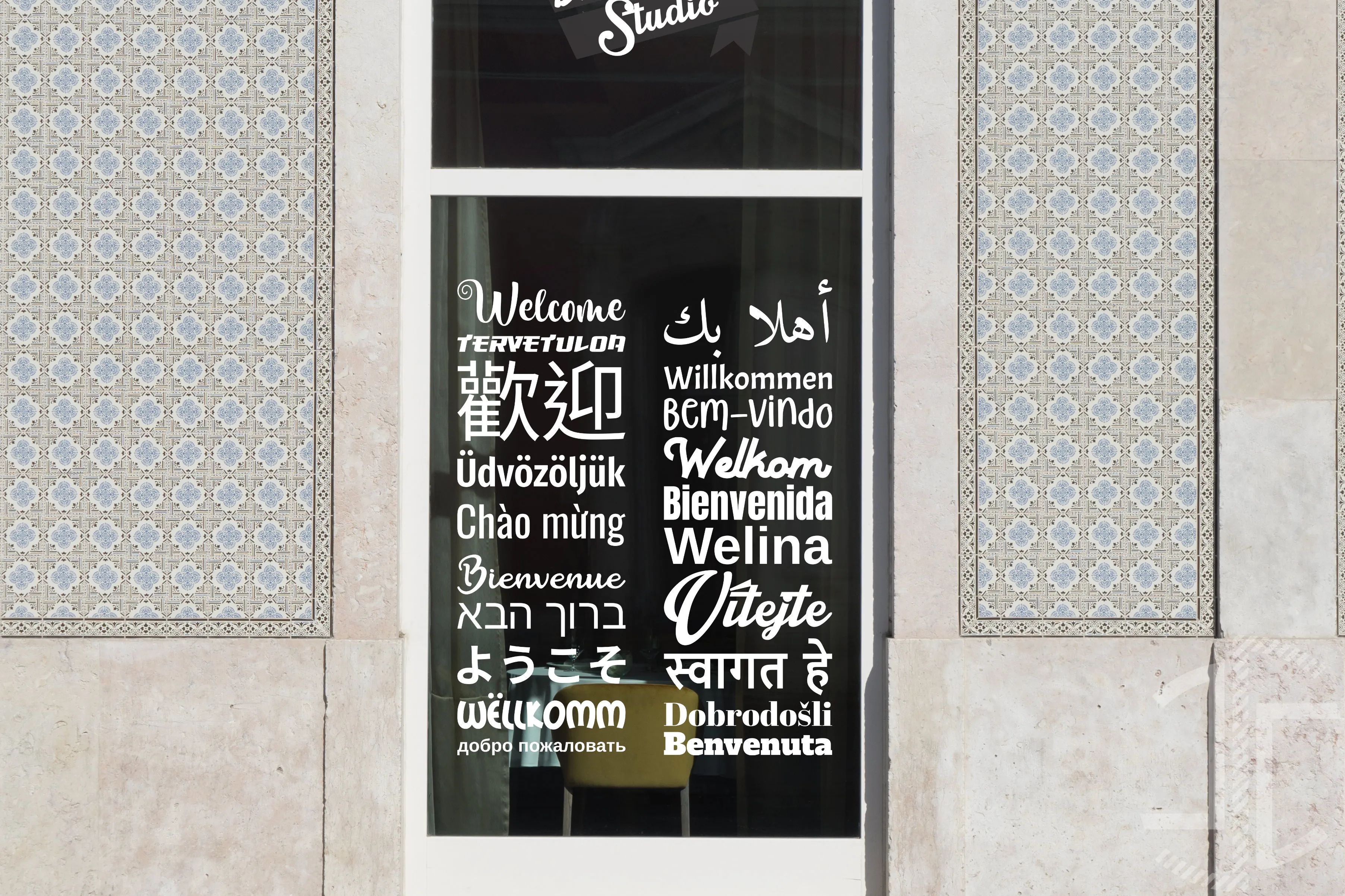 A primeira impressão é a que perdura. Numa montra, numa porta de entrada ou na parede de uma recepção, a forma como se recebe quem chega define o tom de toda a experiência. Este decalque em vinil é mais do que uma saudação; é uma oferta de hospitalidade universal. Ao reunir a palavra "Bem-vindo" numa multiplicidade de idiomas — do português ao árabe, do japonês ao alemão —, não está apenas a decorar um espaço, está a construir uma ponte. Cada tipografia foi cuidadosamente escolhida para refletir a identidade visual da sua língua, criando uma composição que é, ao mesmo tempo, diversa e harmoniosa. É um sinal inequívoco de que ali, naquele espaço, todas as culturas são reconhecidas e valorizadas.