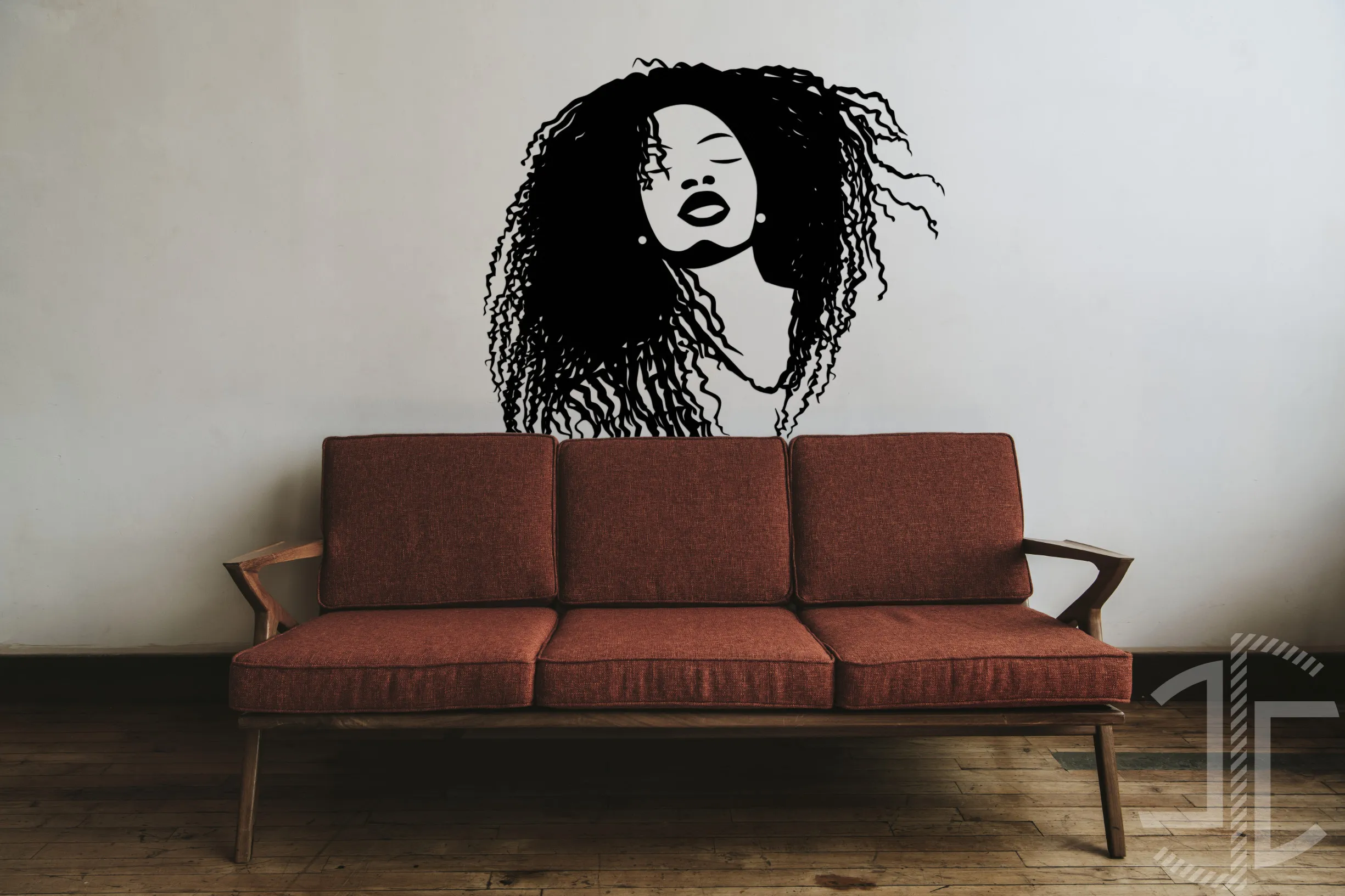 O design é uma celebração da forma e da textura. A silhueta da mulher é definida tanto pelos traços presentes como pelo espaço negativo, uma técnica que confere profundidade e foco. No entanto, é o cabelo que assume o protagonismo. Não é apenas uma cabeleira; é uma coroa de caracóis volumosos e indomáveis, renderizada com uma energia que parece saltar da parede. Cada cacho é uma linha de força, uma declaração de identidade que rejeita padrões e abraça a beleza na sua forma mais autêntica e natural. A expressão da figura, com os olhos fechados e o rosto ligeiramente erguido, transmite um momento de êxtase, de paz interior ou de profunda autoconexão. É um retrato íntimo e poderoso.