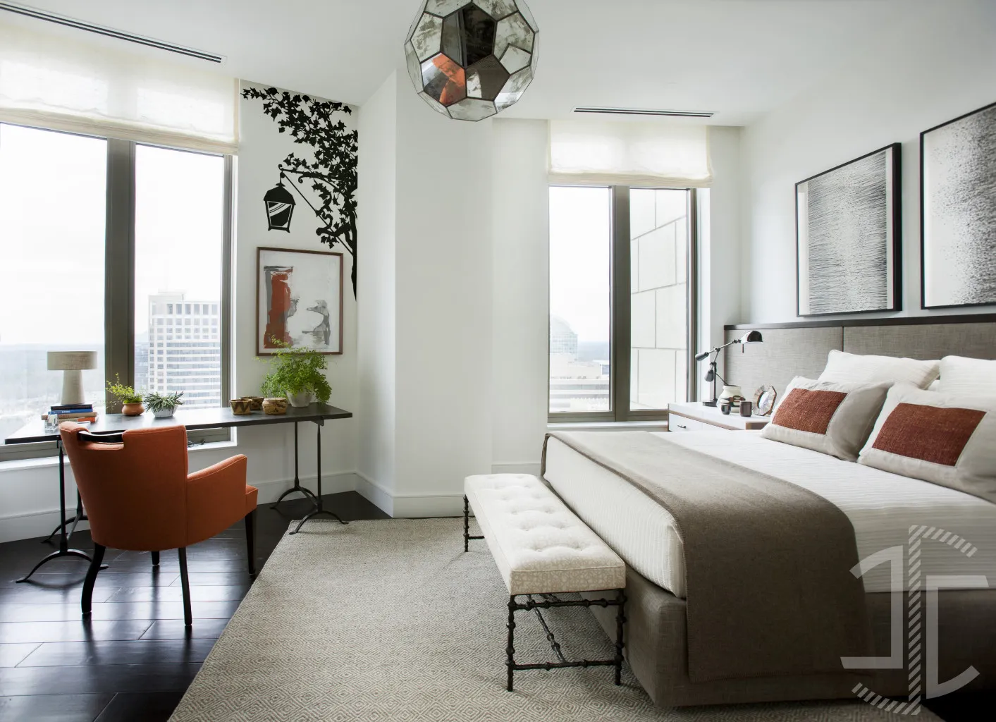 O desenho, aplicado sobre a parede, não se limita a decorar — sugere uma história. É fácil imaginar que, do outro lado da janela, há uma rua silenciosa, talvez molhada pela chuva, onde este candeeiro iluminaria um banco solitário. Aqui, no entanto, a luz é apenas sugerida; o que vemos é a sua ausência, a silhueta recortada que nos obriga a completar mentalmente o cenário.