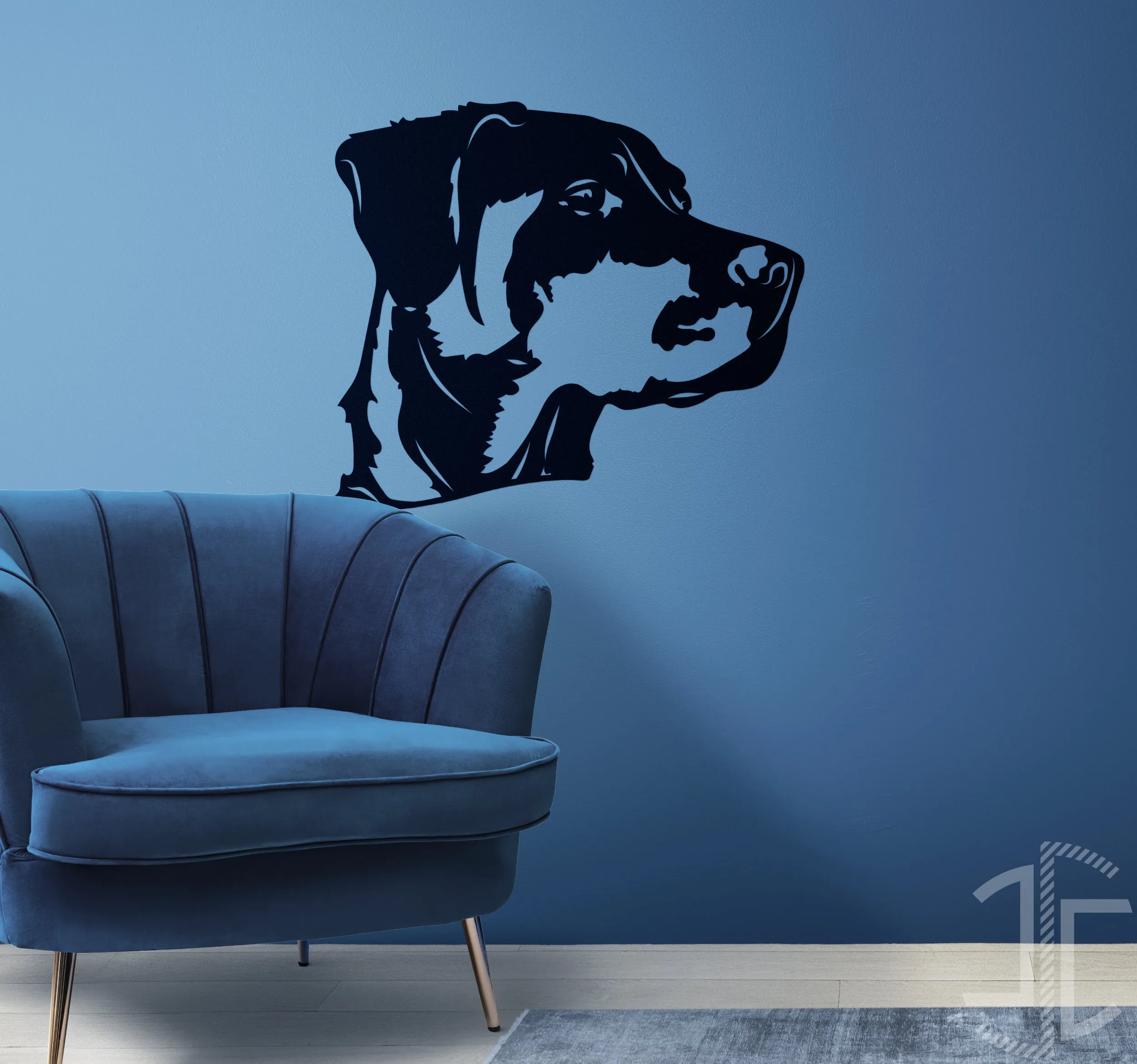 O perfil, que evoca a nobreza de um braco alemão ou outra raça de porte semelhante, é captado num momento de atenção concentrada. O olhar está fixo, a postura é alerta, mas serena. Não há aqui a sentimentalidade fácil de muitas representações de animais de estimação; em vez disso, encontramos uma representação quase totémica da lealdade, da inteligência silenciosa e da dignidade inerente ao animal. A técnica de recorte do vinil, que utiliza o espaço negativo da própria parede como parte integrante da imagem, cria um diálogo visual fascinante entre a obra e o seu suporte. Aplicado sobre uma parede de cor, como o azul profundo do mockup, o contraste resultante é dramático e sofisticado. Esta peça funciona de forma exemplar em espaços que beneficiam de uma declaração de design forte, mas não opressiva, como um escritório, uma sala de estar minimalista ou um corredor de entrada, onde a sua presença silenciosa e vigilante saúda quem chega.