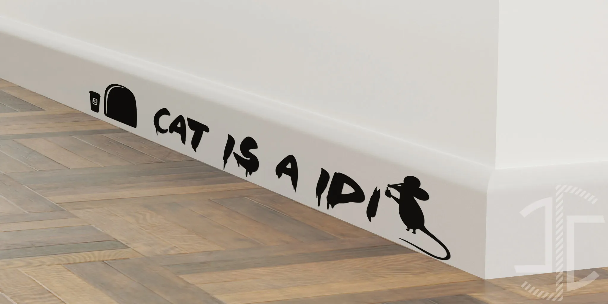 Este design captura a essência da rebeldia urbana através de uma lente surpreendentemente pequena, mas cheia de atitude. A peça central é uma ousada declaração grafada na parede, "CAT IS A IDIOT", cuja tipografia imita o efeito de tinta a escorrer, evocando a estética crua e imediata da arte de rua. A imperfeição da escrita, com as suas letras imperiosamente irregulares, adiciona uma camada de autenticidade e urgência, como se a mensagem tivesse sido deixada de forma apressada, mas com convicção.