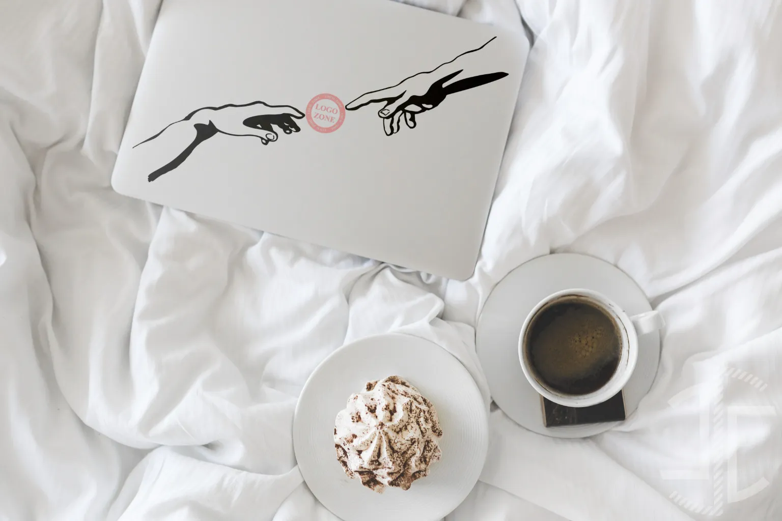 A genialidade desta adaptação reside no vazio que ela enquadra. O espaço intersticial entre os dedos indicadores, que no fresco de Miguel Ângelo crepita com a promessa da “centelha da vida”, transforma-se aqui num palco para o objeto que decora. Aplicado na traseira de um computador portátil, por exemplo, o design não se limita a existir; interage, recontextualizando o logótipo da marca como o ponto focal da criação. A centelha divina já não é um sopro divino, mas talvez o logótipo iluminado da máquina que nos liga ao mundo digital — uma subtil e irónica reflexão sobre as fontes da nossa inspiração contemporânea.