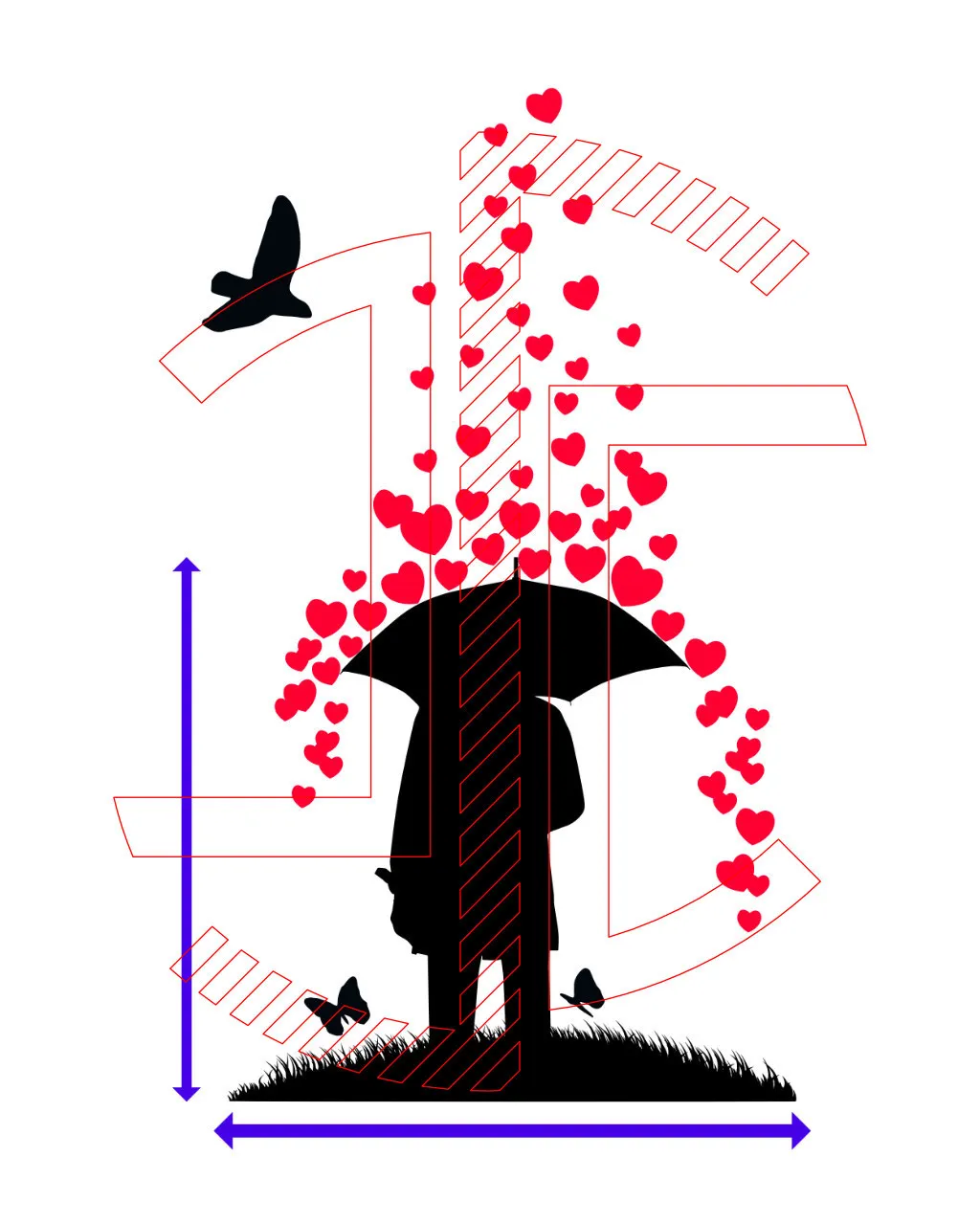- As dimensões são relativas apenas à silhueta da figura. Os corações e restantes elementos serão redimensionados de acordo com essas dimensões escolhidas.