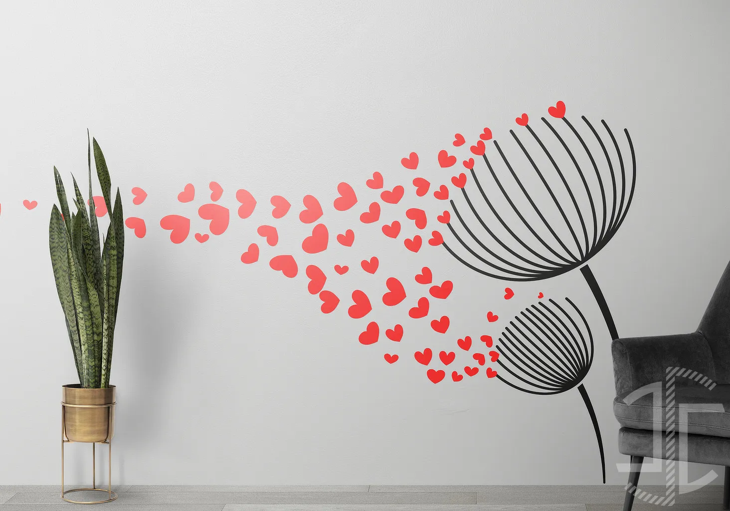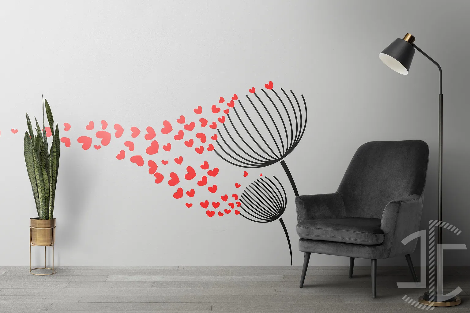 Do ponto de vista de um decorador de interiores, este design oferece várias vantagens: adapta-se facilmente a diferentes estilos de decoração, desde ambientes minimalistas até espaços mais românticos ou boémios; o contraste entre o corpo da planta e os corações cria um ponto focal que atrai o olhar e dá vida a paredes neutras; a aplicação modular dos corações permite personalizar o movimento e a direção do “vento”, tornando cada instalação única; e, por fim, a simplicidade do traço garante que, apesar do impacto visual, a peça não sobrecarrega o espaço, funcionando tanto como elemento central como complemento subtil.