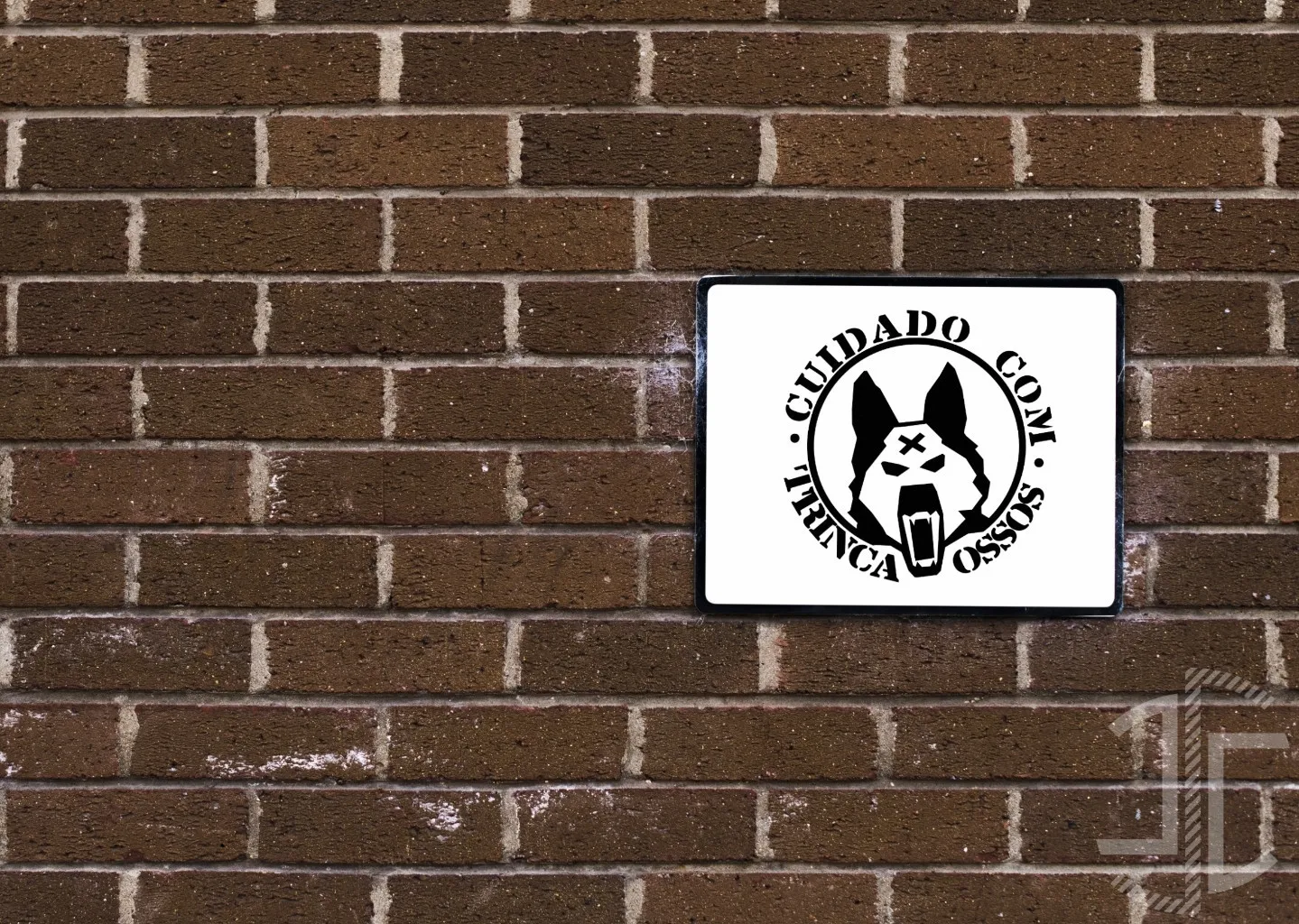 Este design pega no arquétipo do aviso “Cuidado com o Cão” e eleva-o a um emblema, quase um brasão de armas para o guardião da casa. Abandona-se a fotografia genérica ou o desenho rudimentar, em favor de uma iconografia de inspiração "street art" que transforma uma simples advertência num "statement" de identidade. A composição, contida num círculo que lhe confere um ar de selo ou insígnia, é dominada por uma cabeça de cão estilizada, mais próxima de um lobo heráldico do que de um animal doméstico.
