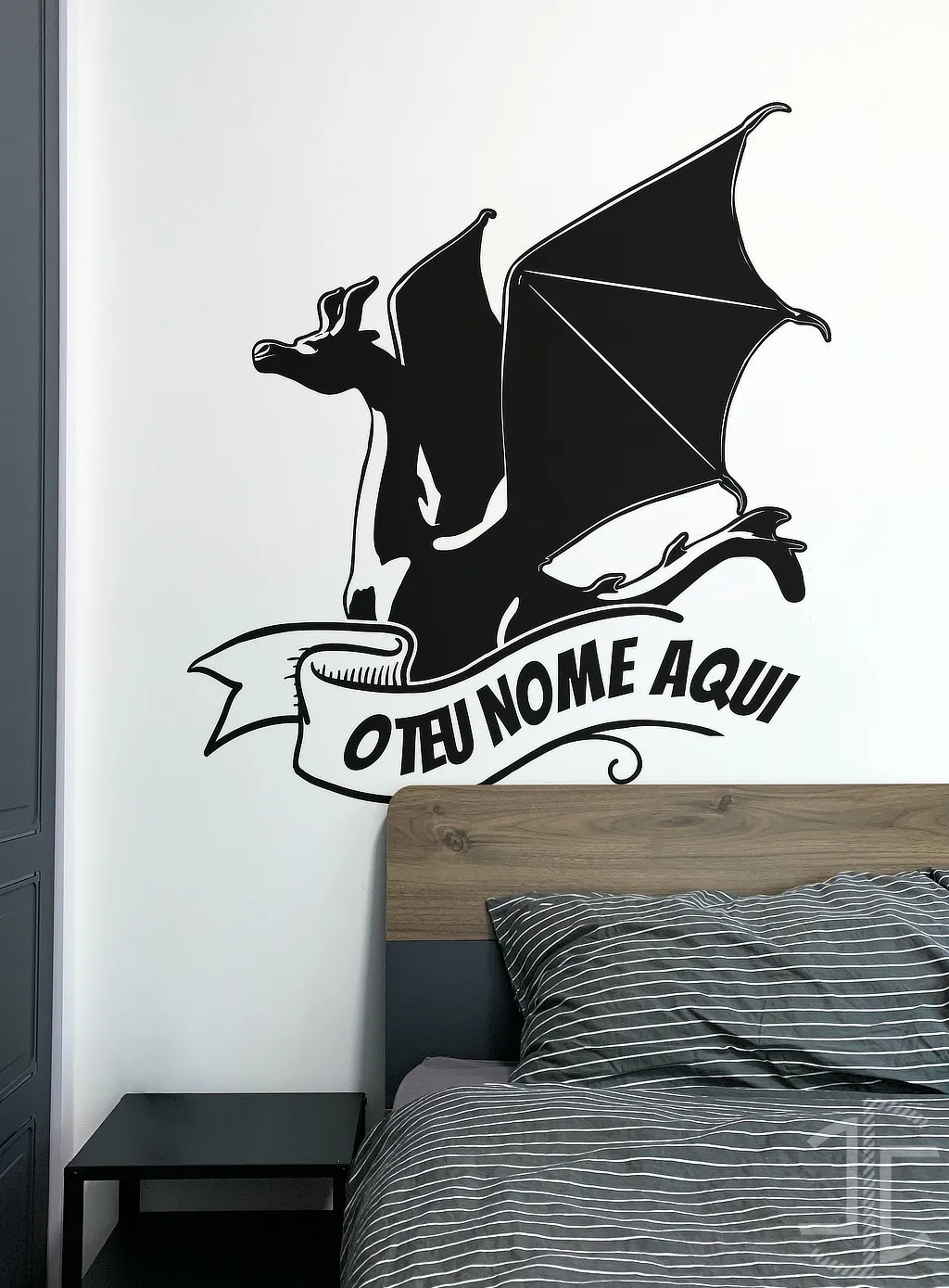 A silhueta do dragão, feita em preto por defeito, evoca força, mistério e uma certa solenidade mitológica. Não é um animal decorativo, é um símbolo. E a faixa abaixo funciona como espaço de expressão — seja para uma citação, um nome próprio, uma provocação ou uma dedicatória. A imagem de apresentação mostra-o aplicado numa parede acima de uma cabeceira, mas a natureza vectorial do design permite adaptações a outras superfícies limpas e lisas, como portas, móveis ou até veículos.