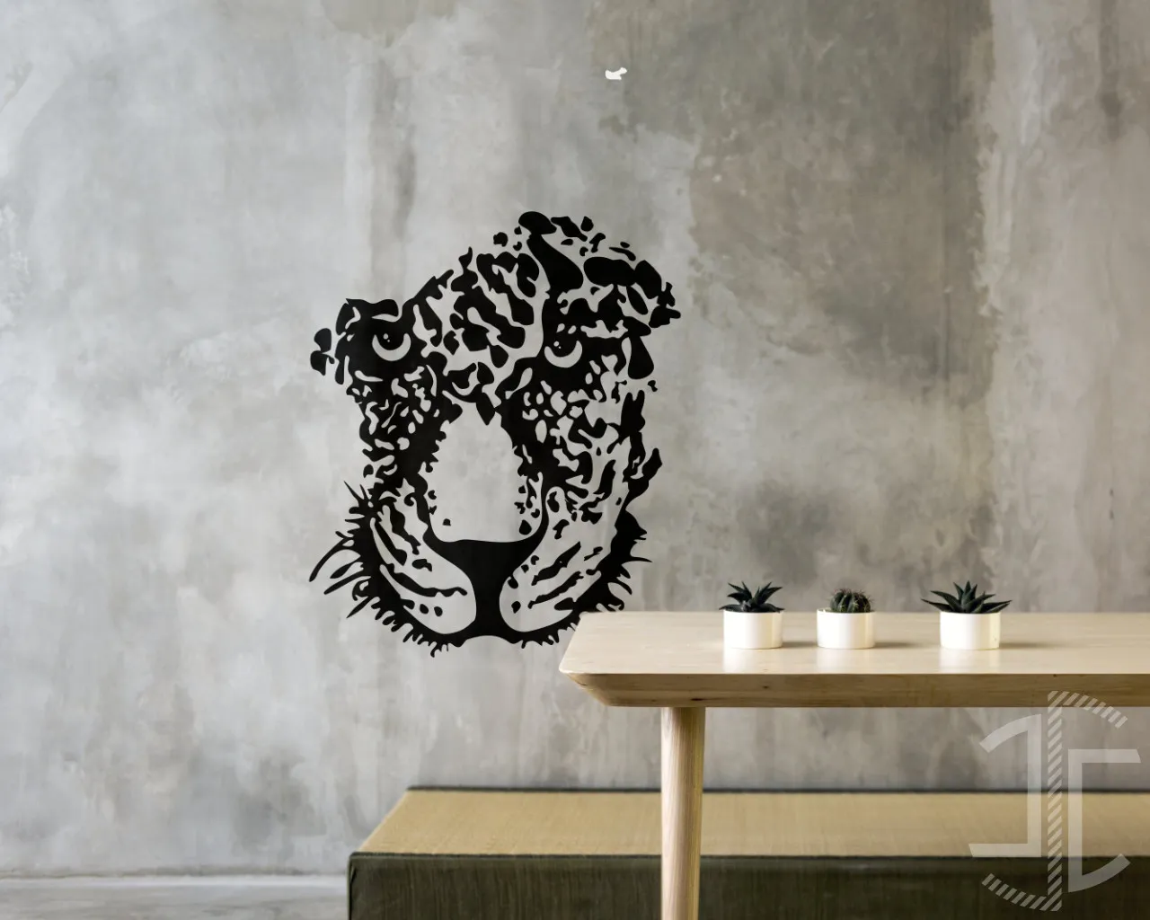 Aplicado a uma superfície, como a parede de betão aparente da imagem, o decalque introduz um elemento de natureza selvagem e indomada no ambiente doméstico. É uma intervenção que joga com o contraste entre o civilizado e o feral, o construído e o instintivo. Mais do que um simples elemento decorativo, é um statement visual, um ícone de força e beleza latente...