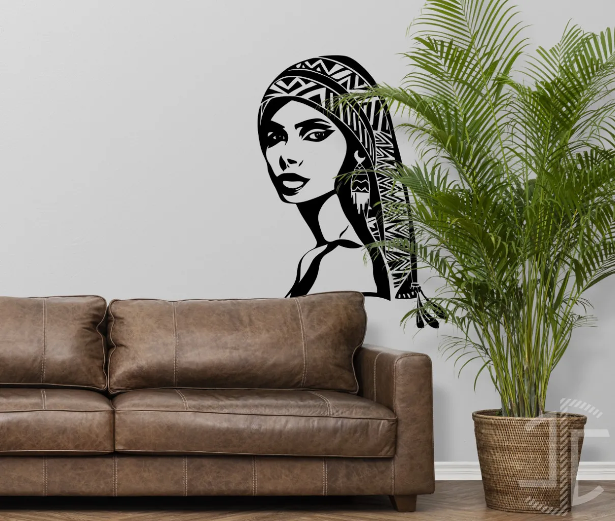 O elemento central do design é, sem dúvida, o turbante ou lenço que adorna a sua cabeça. As suas superfícies são um campo de jogo para padrões geométricos que evocam a riqueza da arte têxtil e da adornação corporal de diversas culturas, nomeadamente de matriz africana. Cada linha, cada triângulo e cada ziguezague conta uma história, sugere uma herança e confere à imagem uma profundidade cultural que transcende a pura estética. A forma como os padrões se integram na silhueta geral, juntamente com o brinco estilizado, cria um equilíbrio visual entre o detalhe intrincado e as áreas de cor sólida que definem o rosto e o pescoço. Aplicado numa parede, este decalque funciona como um ponto focal magnético, ideal para ambientes que procurem uma declaração de intenções artísticas e uma ligação a algo ancestral e universal.