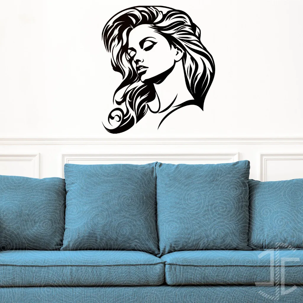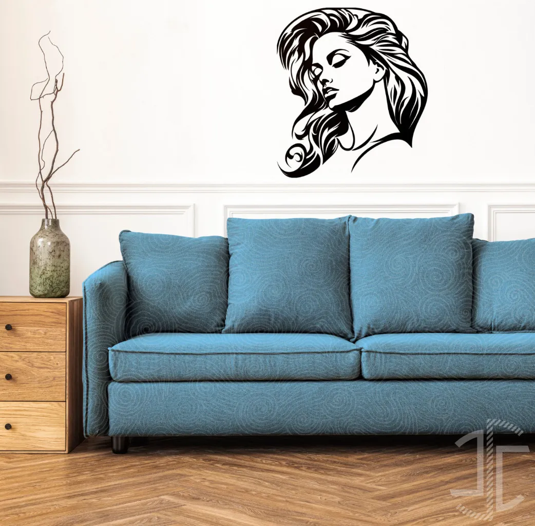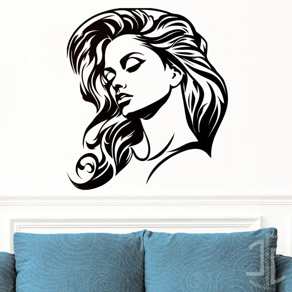 O design é um jogo de contrastes: a energia cinética contida nas linhas fluidas e turbulentas do cabelo contrasta com a quietude absoluta do rosto. O cabelo, uma cascata estilizada que parece ter vida própria, enquadra uma face de serenidade melancólica, com os olhos fechados e uma expressão que sugere um refúgio no mundo interior. O estilo namora com a ilustração gráfica e a arte da tatuagem, utilizando linhas negras e incisivas para esculpir a forma a partir do vazio da parede, o que confere à peça uma presença marcante e contemporânea.