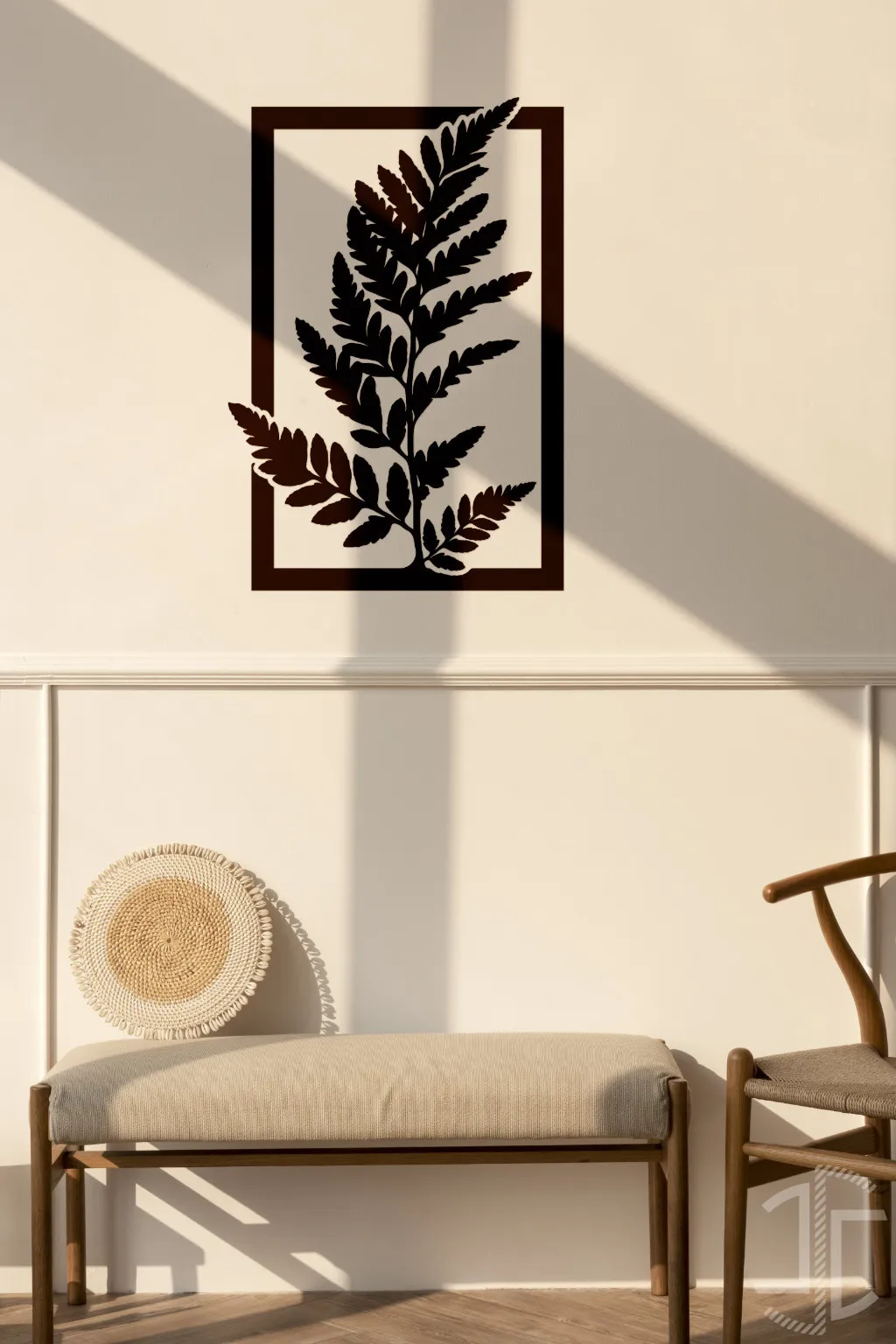 O design é apresentado em silhueta preta, uma escolha que confere à imagem uma elegância intemporal e uma clareza gráfica acentuada. A folha de feto é habilmente enquadrada numa moldura retangular simulada, que, em vez de a confinar, serve para realçar a sua forma e complexidade. A intencionalidade do design manifesta-se no modo como partes da folha se estendem para além dos limites superior e inferior desta moldura, criando uma sensação de dinamismo e de crescimento orgânico que desafia as fronteiras predefinidas. Este pormenor adiciona um movimento subtil e uma profundidade visual à peça, impedindo que se torne estática e conferindo-lhe um caráter vivo.
