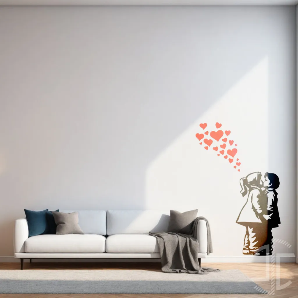 As figuras, integralmente a preto, estão solidamente plantadas no espaço, conferindo ao momento uma sensação de presença e de realidade palpável. Da união dos seus lábios, emana uma nuvem ascendente de corações, representada numa vibrante tonalidade de vermelho. Este contraste cromático é opcional e o cliente pode escolher a versão com os corações em preto ou branco. Enquanto as crianças representam o plano físico e terreno, os corações simbolizam a emoção etérea e efémera que o gesto gera. Esta ascensão visual sugere a leveza, a alegria e a elevação que caracterizam o sentimento amoroso na sua forma mais pura, quase como se o afeto se materializasse e flutuasse, livre de peso e de gravidade.