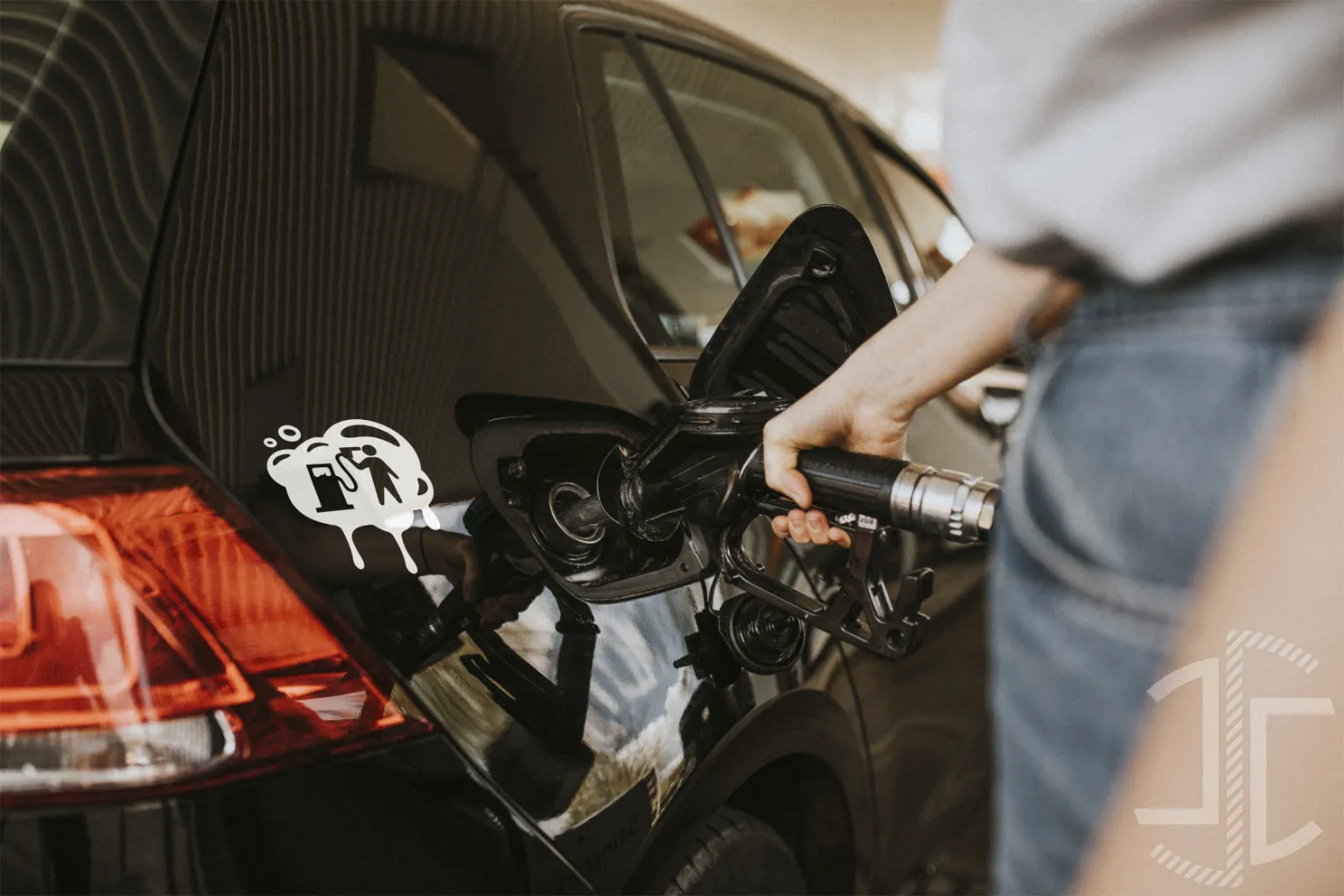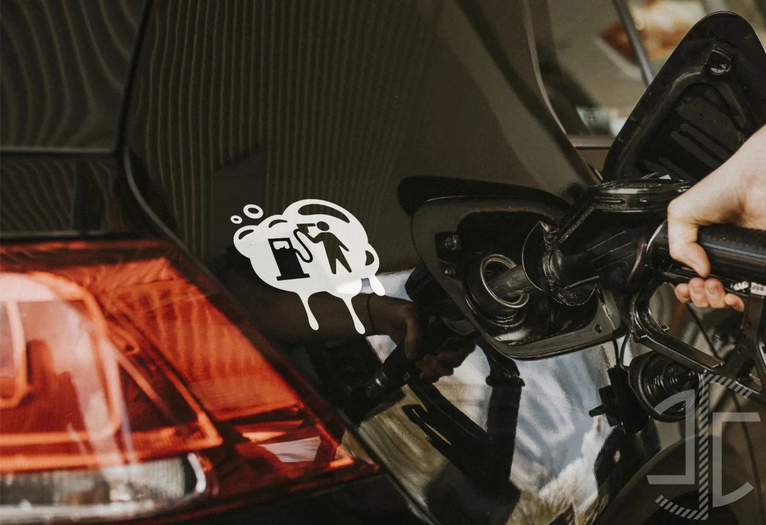 Ah, as gasolineiras. Esse oásis de progresso moderno que, paradoxalmente, nos seca a carteira mais depressa do que o deserto do Saara nos suga a água por um cantil furado. Este autocolante, que contrasta vivamente com o fundo escuro, oferece-nos uma interpretação visual no mínimo... pungente. Emoldurado numa forma orgânica, quase como uma bolha de pensamento que começa a derreter sob o peso da realidade, surge a icónica silhueta de uma bomba de combustível.