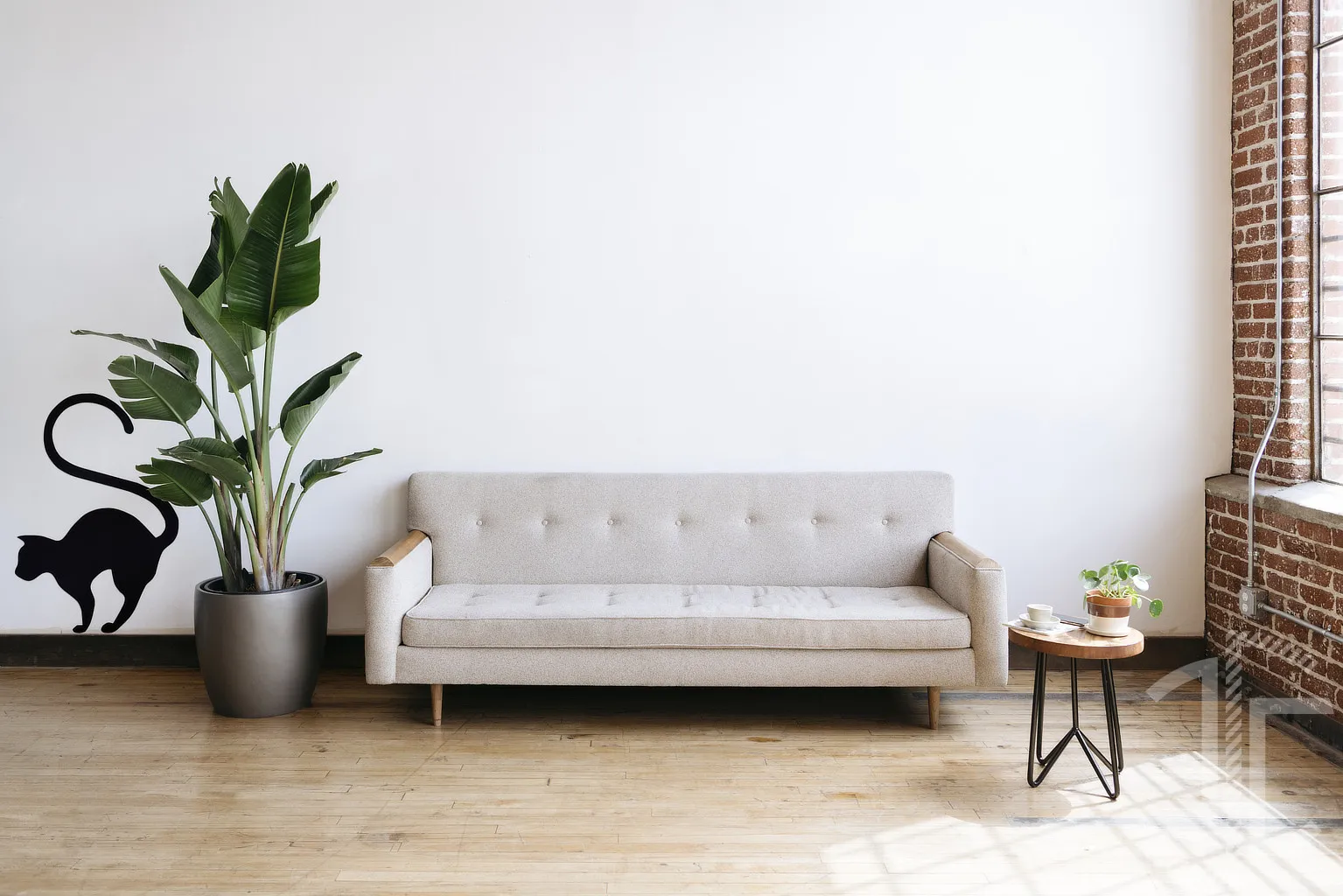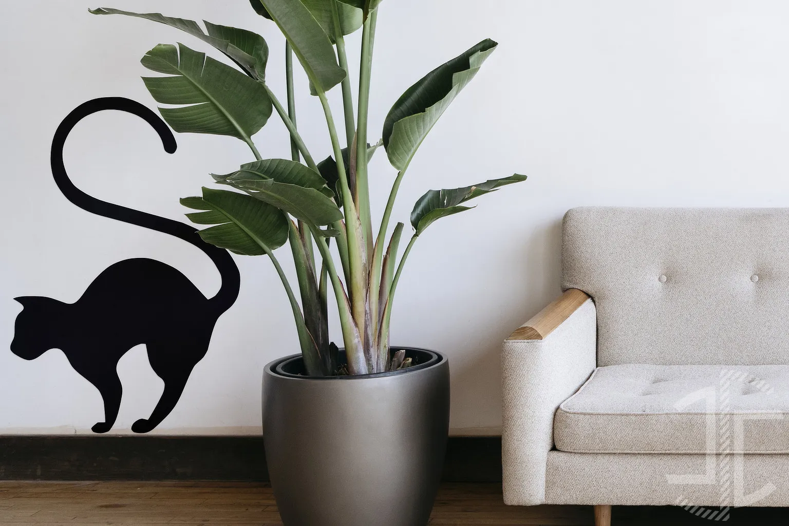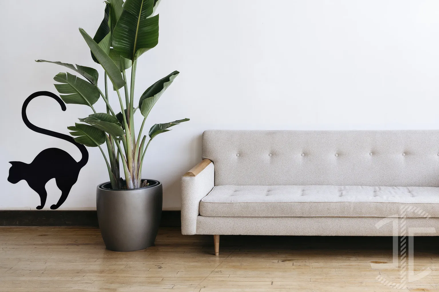Há algo de silenciosamente teatral na forma como uma simples silhueta pode transformar uma parede num palco. Aqui, a figura felina surge num momento de pausa e tensão: o corpo arqueado, a cauda erguida, como se estivesse prestes a avançar sobre algo invisível — ou talvez apenas a saborear o instante. O contraste entre o sólido do autocolante e a textura viva da planta real ao lado cria um jogo visual curioso, quase cinematográfico, onde o real e o gráfico se espreitam mutuamente.