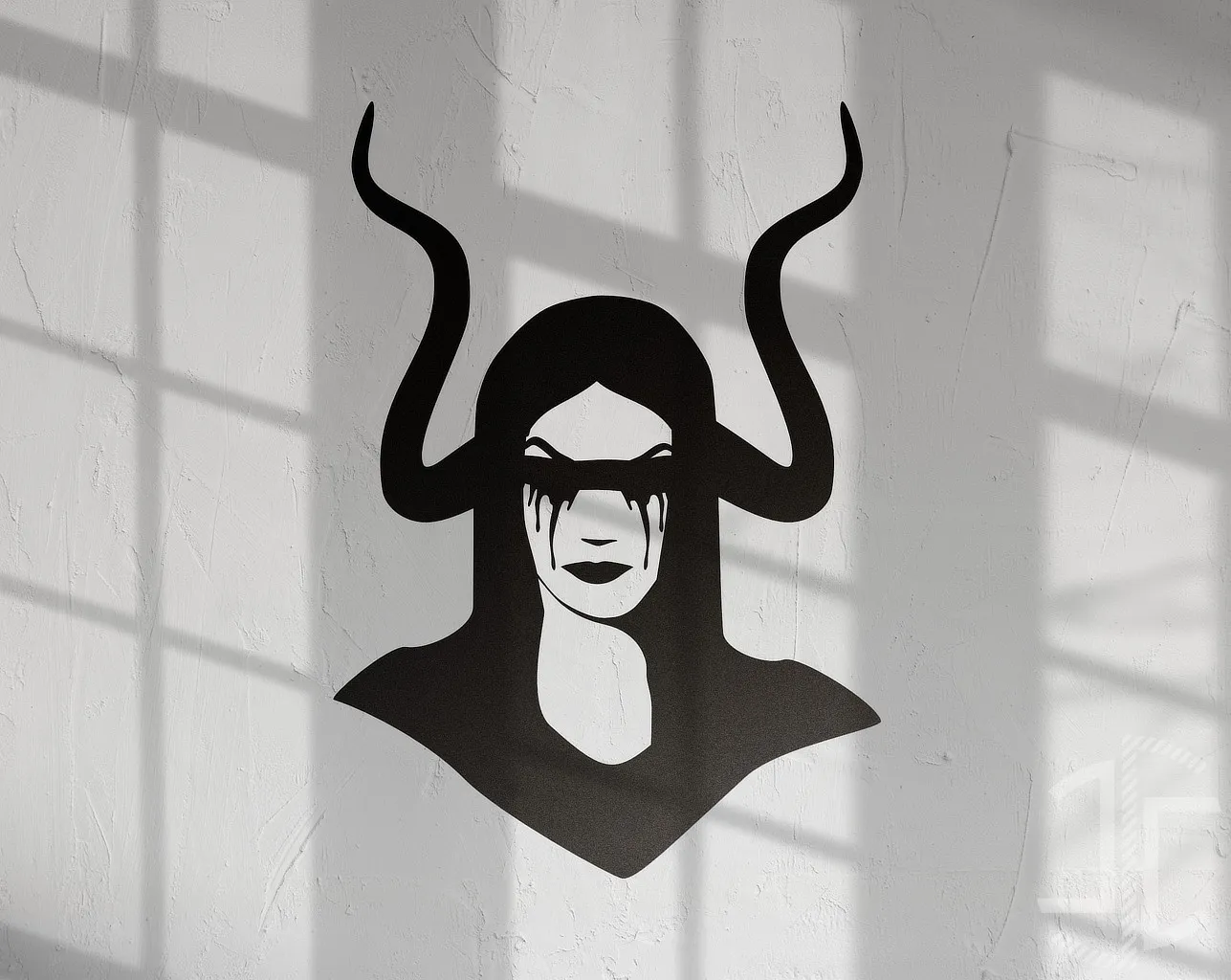 Os cornos que emergem da cabeça não são mero adorno estético. Na simbologia mística e no imaginário ocultista, eles podem representar poder, ligação a entidades sobrenaturais, fertilidade ou mesmo rebeldia contra dogmas estabelecidos. Em tradições pagãs, são associados a divindades ligadas à natureza e à força primitiva; no ocultismo moderno, podem assumir significados mais sombrios, como a invocação de forças proibidas ou a inversão de valores espirituais. Aqui, o seu desenho limpo e curvo reforça a ideia de que esta figura habita um espaço entre o humano e o mítico.