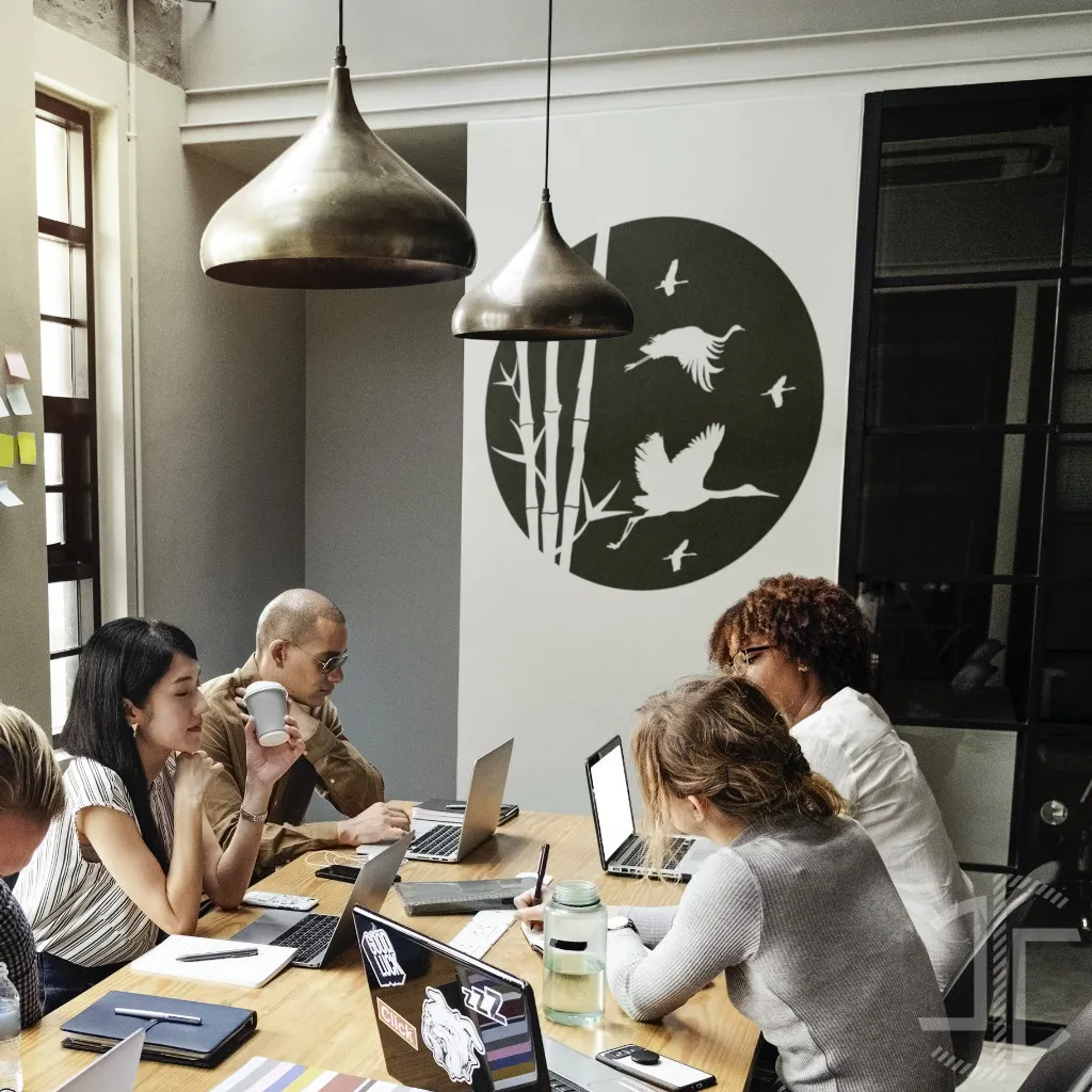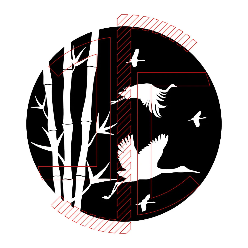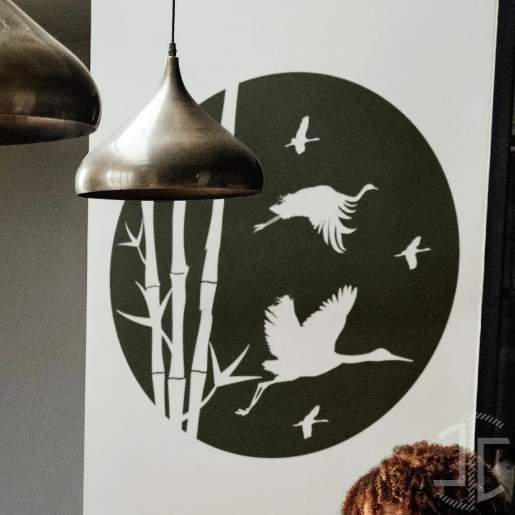 A composição apresenta dois grous japonêses em pleno voo, acompanhado por outras aves mais pequenas, recortados sobre um fundo oval em tom monocromático. À esquerda, hastes de bambu completam a cena, criando um enquadramento natural que equilibra verticalidade e fluidez. O resultado é minimalista, mas carregado de simbolismo.