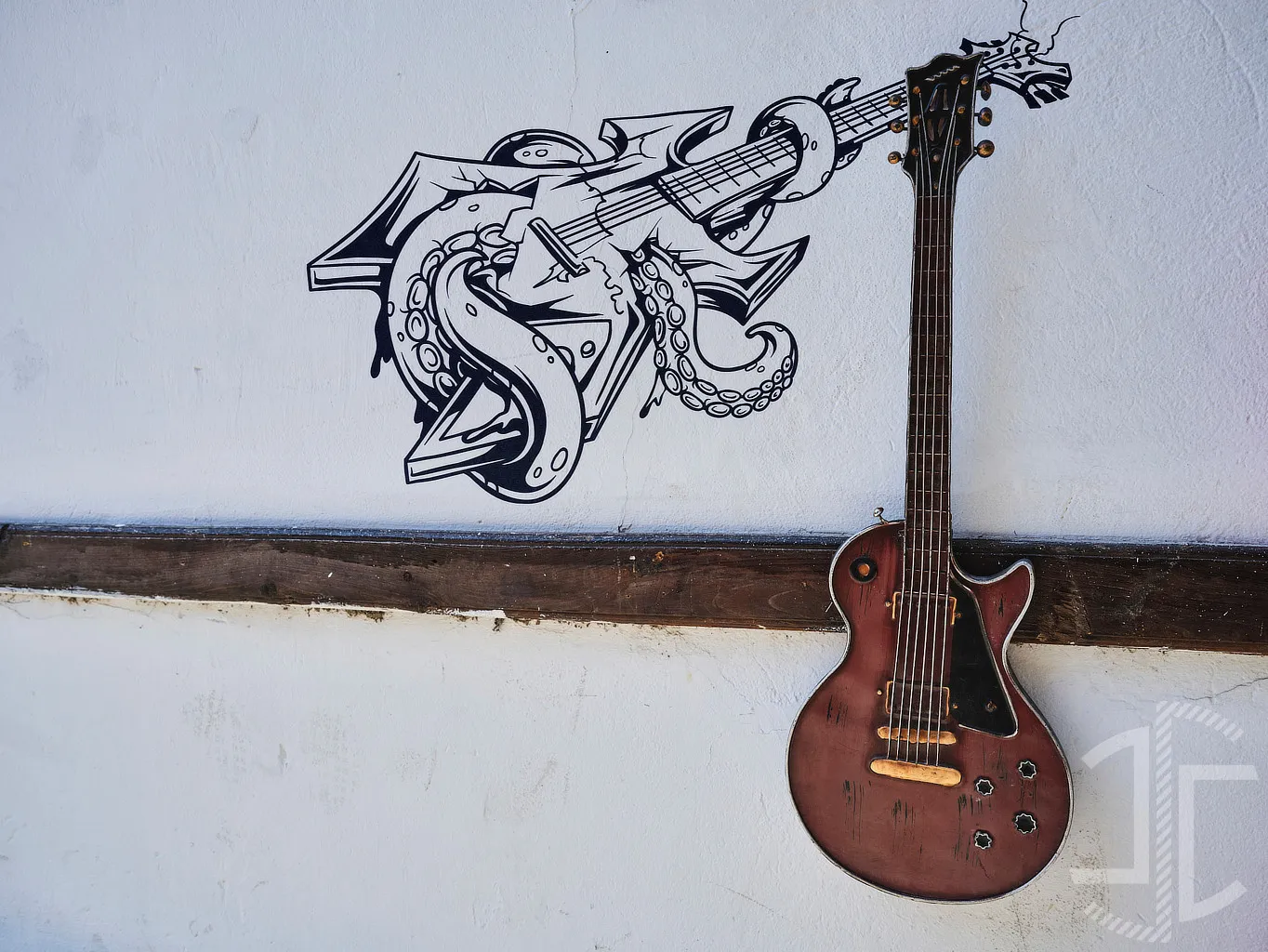 O contraste do traço preto e branco com a parede clara amplifica a sensação de cartaz urbano, quase mural de protesto. É como se alguém tivesse decidido que o rock precisava de um elemento marítimo — não para o suavizar, mas para o tornar mais perigoso. Essa criatura paciente e calculista (um polvo.. o kraken.. quem sabe?), enrola-se no braço da guitarra como quem sabe que, mais cedo ou mais tarde, vai arrancar um acorde final e definitivo.