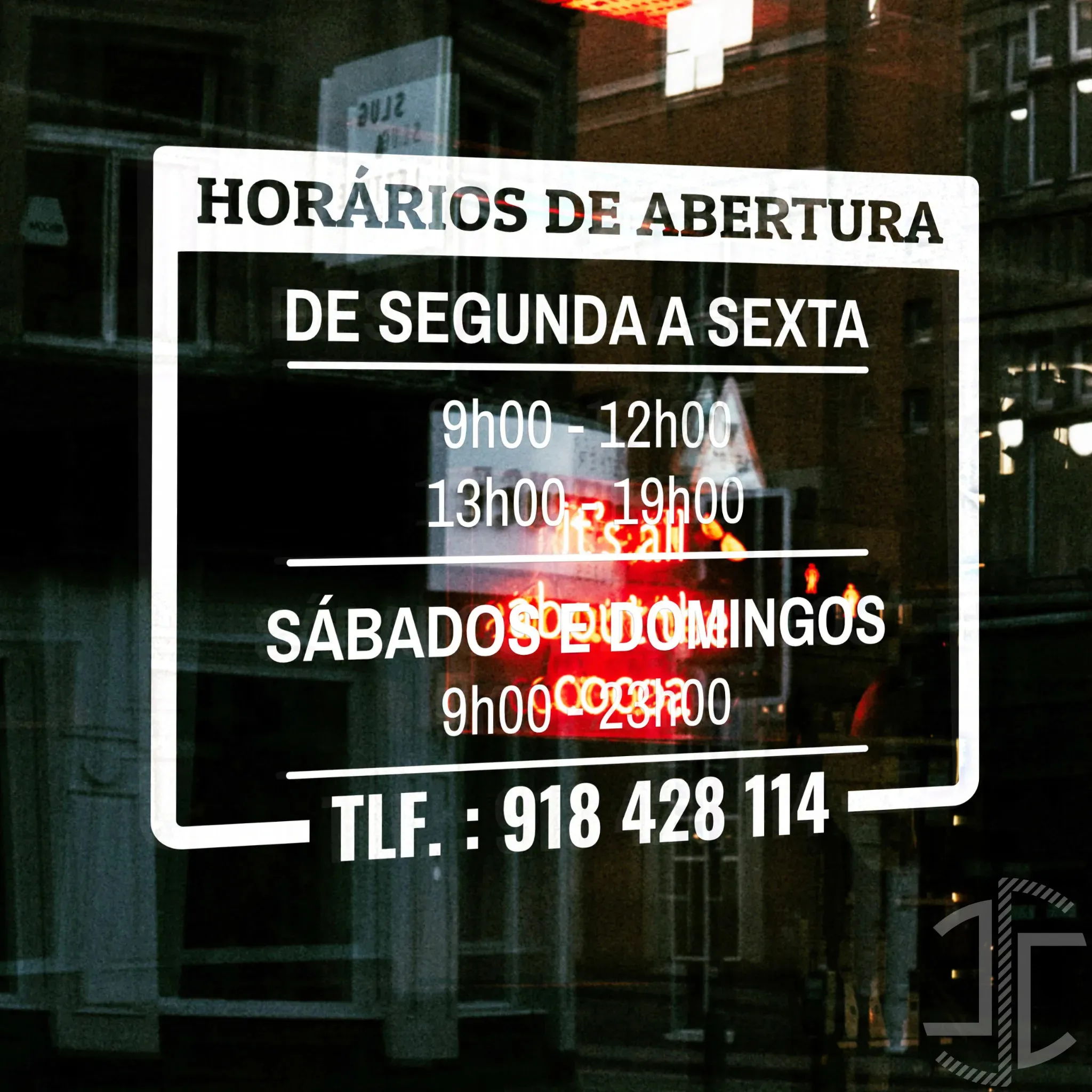 Dê ao seu estabelecimento uma identidade visual forte e direta com este vinil de horário. O seu design de inspiração industrial e a tipografia de stencil transmitem uma imagem de autenticidade e confiança, ideal para negócios com personalidade, como bares, estúdios de tatuagem, barbearias ou oficinas. A informação é apresentada de forma clara e imediata, garantindo que os seus clientes sabem exatamente quando o encontrar. Totalmente personalizável, este autocolante adapta-se perfeitamente às suas necessidades. Para uma solução mais duradoura e prática, recomendamos a produção em formato espelho (invertido), que permite a aplicação pelo interior da montra. Assim, o seu horário fica protegido das intempéries e do desgaste diário, mantendo um aspeto impecável por muito mais tempo.
