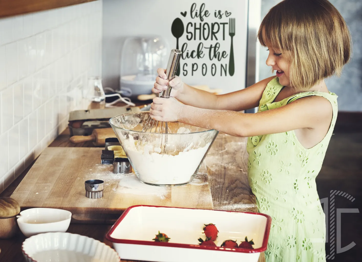 Este decalque de parede é um pequeno manifesto gastronómico, uma filosofia de vida reduzida à sua mais doce e imediata conclusão. A composição tipográfica é, em si, uma declaração de intenções. A frase "Life is short, lick the spoon" ("A vida é curta, lambe a colher") mistura fontes de forma deliberada: um tipo de letra cursivo e amigável para a chamada à ação, contrastando com um "SHORT" em maiúsculas, com um peso visual que serve de argumento irrefutável. As silhuetas de um garfo e de uma colher que ladeiam o texto não deixam margem para dúvidas: estamos no território sagrado da cozinha.