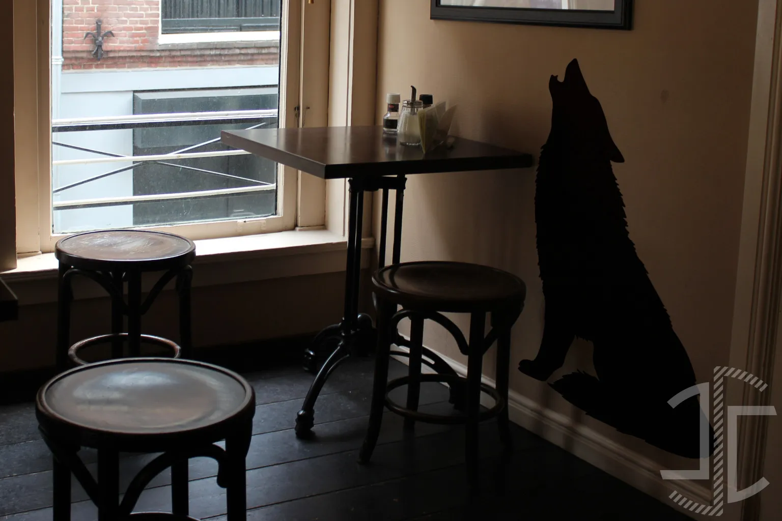 A aplicação desta imagem num espaço interior, como a parede de um café ou de uma sala de estar, como sugerido no contexto, cria uma tensão visual fascinante entre o selvagem e o domesticado. O lobo, símbolo por excelência da liberdade indomada e da natureza em bruto, é trazido para dentro do espaço humano, servindo como um recordar constante de um mundo exterior que opera segundo as suas próprias leis. Funciona, assim, como um portal simbólico, uma janela para a vastidão e o mistério que coexistem com a nossa realidade quotidiana.