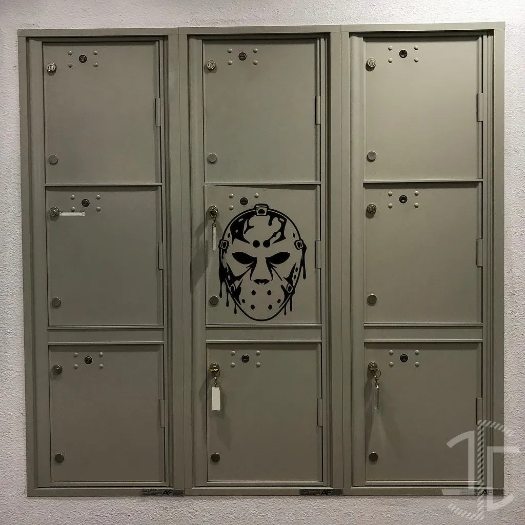 Na imagem de exemplo, o autocolante surge aplicado numa porta de cacifo metálico — uma escolha que reforça o ambiente industrial e ligeiramente inquietante. Mas convém sublinhar: trata-se apenas de uma sugestão visual. O produto é um autocolante em vinil, e pode ser aplicado em qualquer superfície lisa e limpa, desde que livre de pó ou gorduras. Portas, paredes, móveis, equipamentos electrónicos… tudo é território possível para esta intervenção gráfica, desde que respeitadas as condições de aderência.