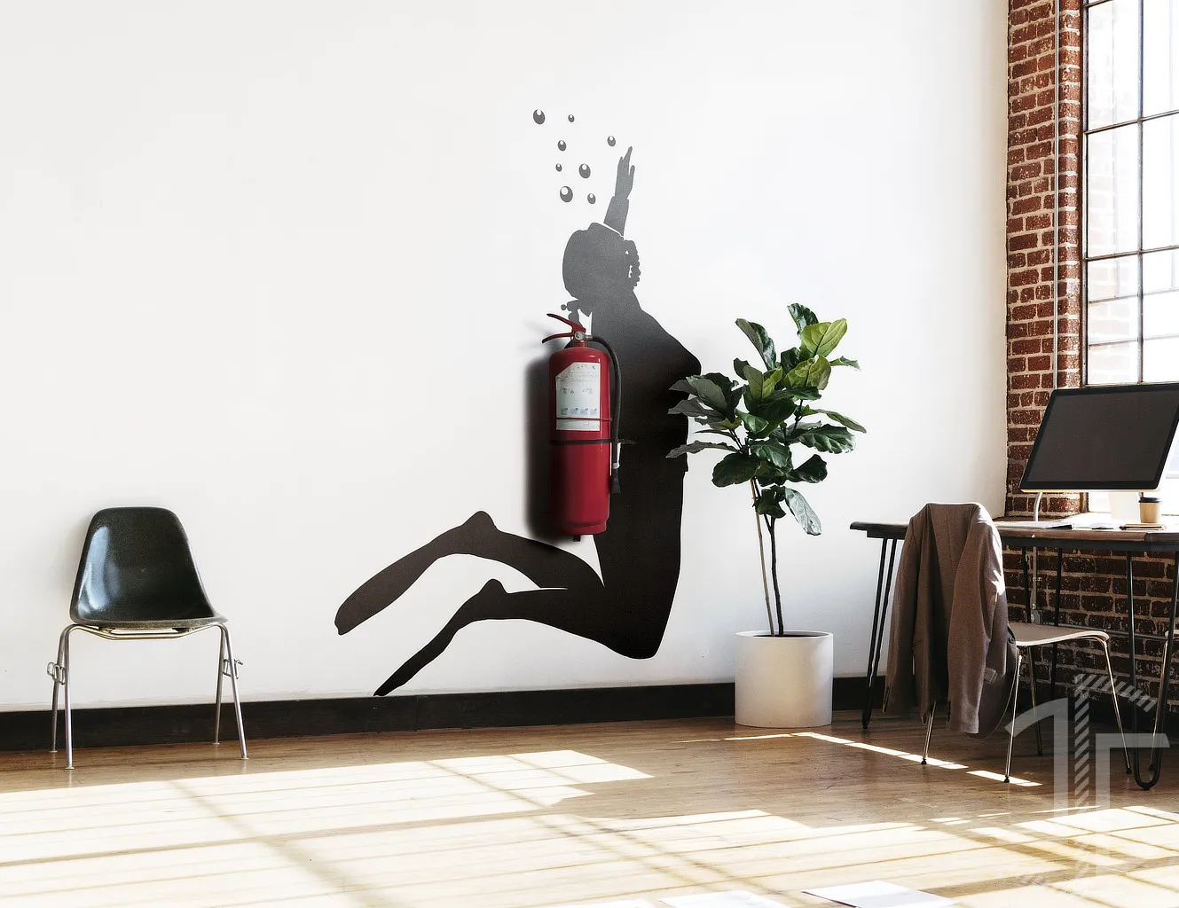 O detalhe mais engenhoso continua a ser a zona das costas, onde o espaço da botija de ar foi desenhado com precisão para coincidir com o tamanho padrão de um extintor de incêndio. O resultado é uma fusão visual inesperada, onde o equipamento de segurança se transforma num acessório gráfico, integrado com elegância e ironia no corpo da figura. As pequenas bolhas que saem da máscara reforçam a ilusão de movimento, criando assim uma atmosfera subaquática.
