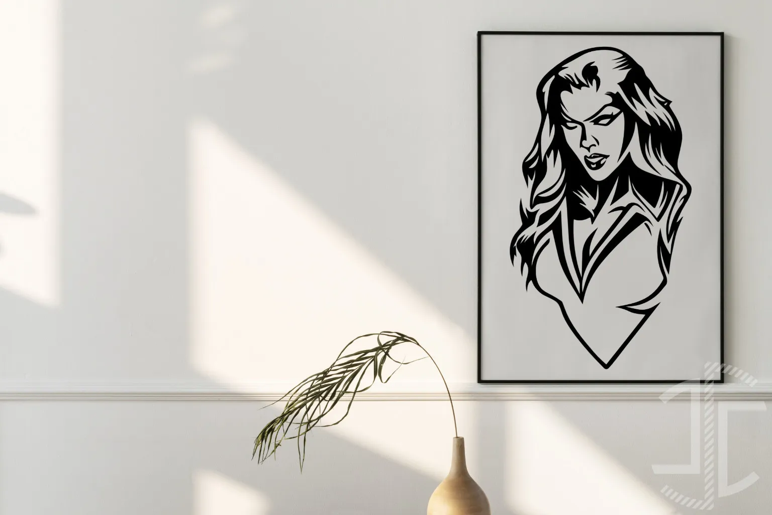 Este ficheiro digital apresenta o busto de uma figura feminina, intitulada "Mulher Super-Herói", num traço vincadamente gráfico e de alto contraste, a preto e branco. A estética remete de imediato para a arte da banda desenhada, mas depurada até ao essencial, onde a ausência de cor e de meios-tons força a linha a carregar toda a expressividade da peça. Cada contorno é assertivo, definindo o cabelo volumoso, os traços faciais angulares e a gola do uniforme com uma economia de meios que amplifica o impacto visual.