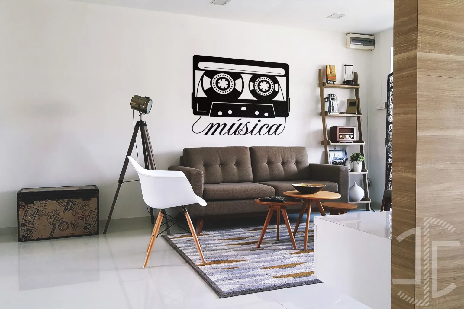 Da base desta forma geométrica, como se fosse a própria fita magnética a desenrolar-se, brota a palavra “música”. A escolha de uma tipografia caligráfica, fluida e orgânica, cria um contraste deliberado com a rigidez mecânica do objeto. É a fusão simbólica entre o contentor e o conteúdo, a máquina e a alma. Mais do que simples nostalgia, a peça evoca o ritual da escuta e da partilha numa era pré-algoritmo, onde a curadoria de uma mixtape era uma declaração de afeto e um demorado ato de dedicação...