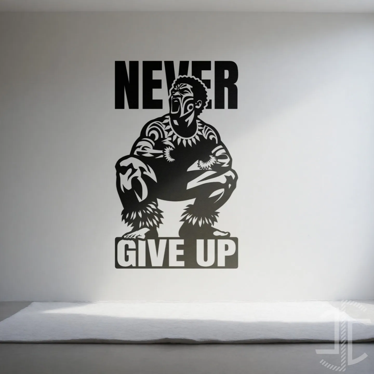 Minimalista em alto contraste a preto e branco destacam-se os detalhes tribais e a expressão facial marcante. As palavras "NEVER" e "GIVE UP" enquadram a composição de forma impactante transmitindo um sentimento motivacional!