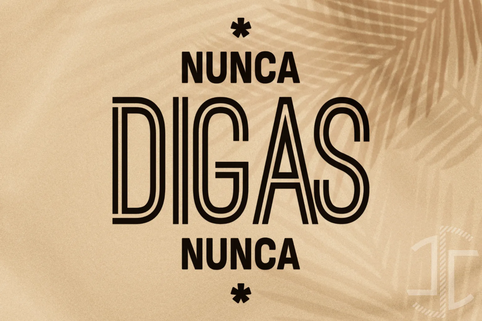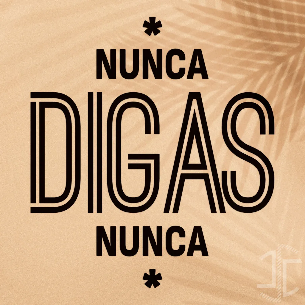 Uma declaração de intenções, apresentada com uma arquitetura tipográfica que é, em si mesma, uma lição sobre a mensagem. A composição joga de forma inteligente com a hierarquia e o peso visual. A palavra central, “DIGAS”, domina a composição em tamanho, mas a sua construção em linhas finas confere-lhe uma leveza etérea, quase transparente. Em contraste, as palavras “NUNCA”, que a enquadram, são sólidas, compactas e assertivas. Este jogo visual cria um paradoxo interessante: o verbo, a ação de dizer, é apresentado como algo flexível e aberto, enquanto o advérbio do absoluto é pesado, imutável.