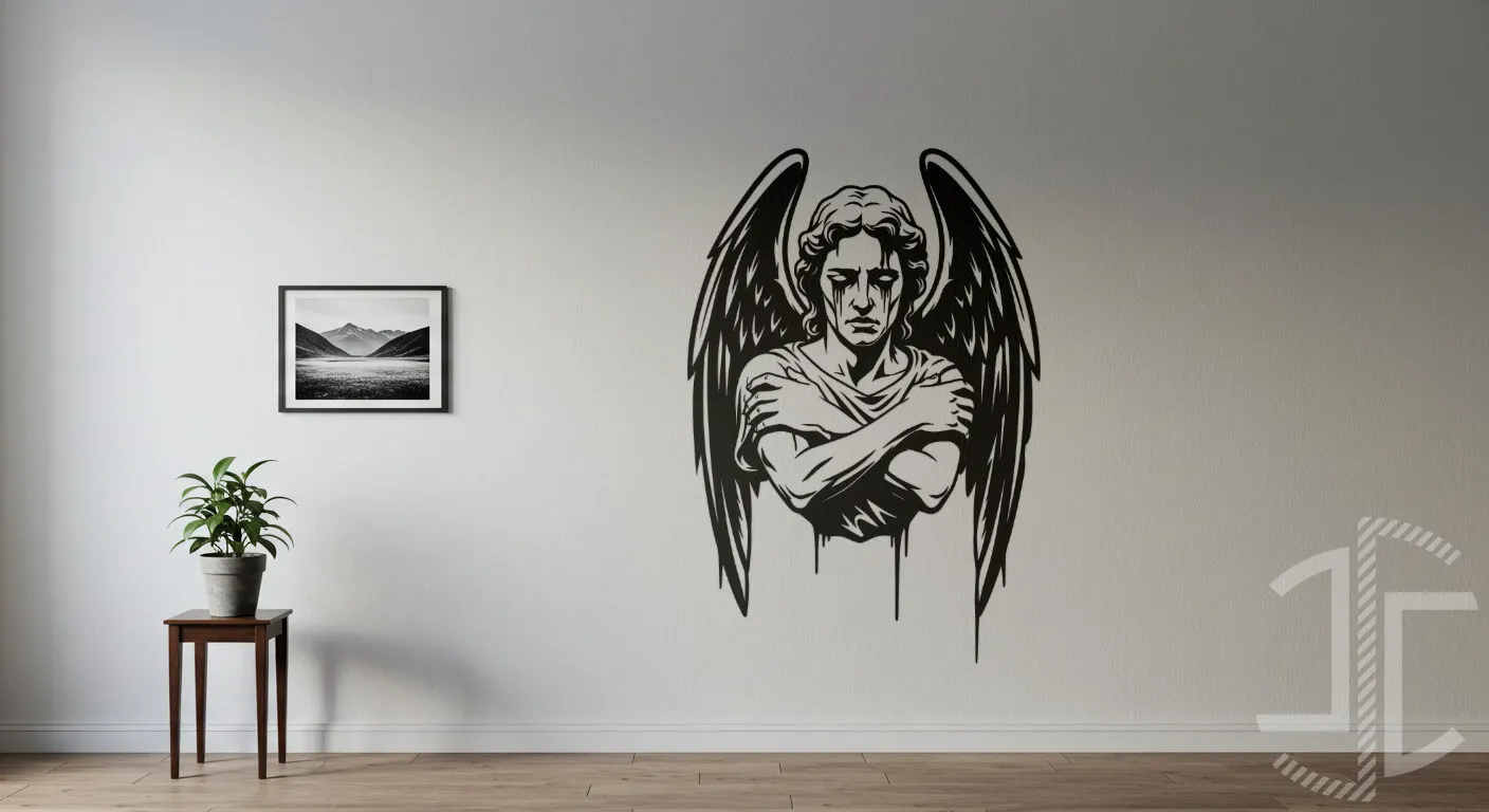 As asas densas, não deixam margem para dúvidas: é um anjo. Mas não o anjo etéreo e luminoso das pinturas renascentistas — este é um anjo brutalista, pesado, quase gótico. Talvez um anjo da guarda que falhou a sua missão, talvez um mensageiro que viu demasiado. A pose transmite recolhimento e sofrimento, como se carregasse o peso de algo irreparável.