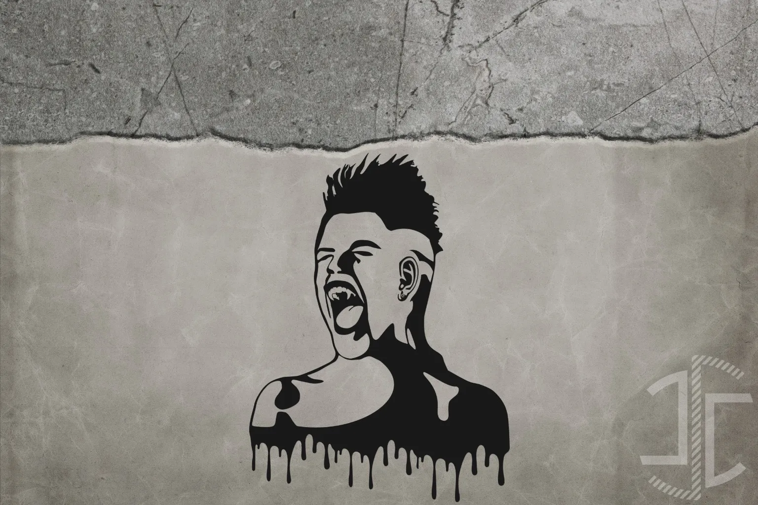 "O Grito" — terceira variação sobre o tema — apresenta-se como uma figura em suspensão entre o humano e o monstruoso. A silhueta, marcada por um moicano agressivo, olhos cerrados e boca escancarada, parece congelada num instante de fúria ou desespero. Os caninos salientes não são apenas traço estético: são o sinal de uma transformação incompleta, de uma identidade em conflito.