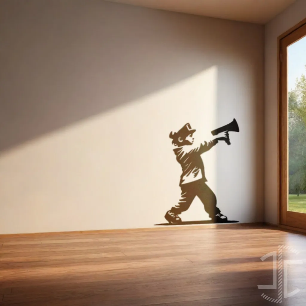 "O Pequeno Protestante", materializa-se num decalque decorativo de vinil que capta a atenção pela sua simplicidade formal e pela complexidade da sua mensagem. A imagem central, executada com a precisão de um stencil, apresenta a silhueta de uma criança empunhando um megafone e apontando-o de forma assertiva para um ponto invisível, sugerindo um ato de comunicação ou, mais precisamente, de desafio.