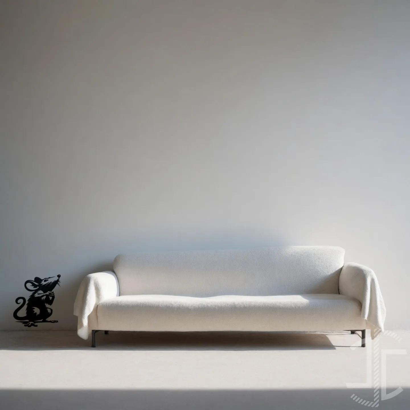 Este rato estilizado, de olhar sonhador e pose determinada, poderia ser o protagonista de uma pequena aventura ou fábula urbana. As linhas pretas e brancas dão-lhe um ar simpático, mas também de quem não brinca em serviço – provavelmente à procura de queijinho ou de respostas para a vida. Por vezes, até o mais pequeno dos seres ensina-nos o valor da persistência.