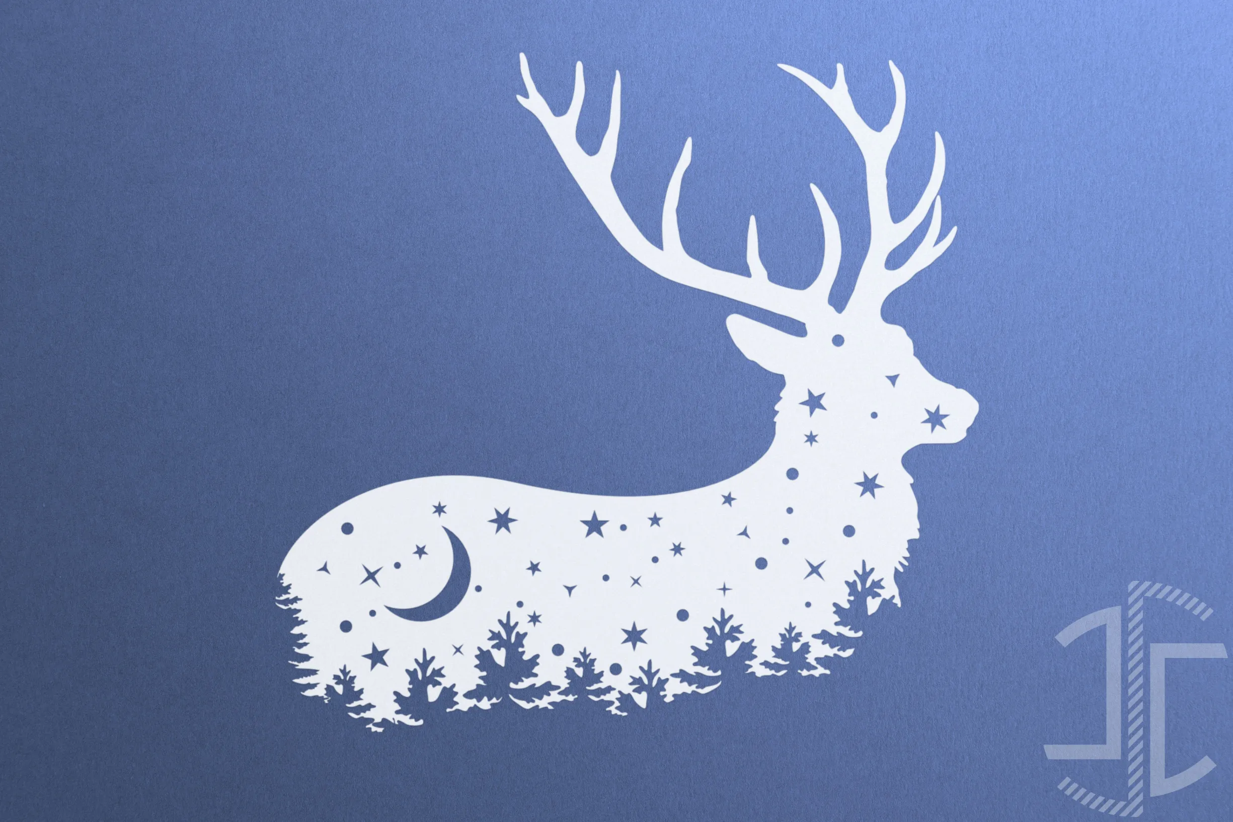 Nesta composição, a majestosa silhueta de um veado abandona a sua forma sólida para se tornar um portal para uma paisagem celestial. Através de um elegante jogo de espaço negativo, o corpo do animal revela um cenário noturno: uma linha de floresta serve de base, e acima dela, uma lua crescente e uma constelação de estrelas flutuam num firmamento imaginário. É uma peça que funde o terrestre com o cósmico de uma forma subtil e poética.