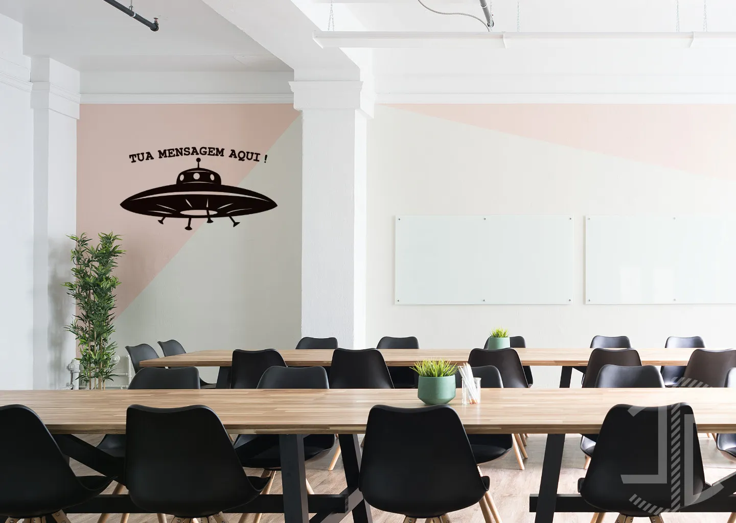 É uma imagem que carrega décadas de cultura popular, da paranoia da Guerra Fria à promessa de encontros imediatos de terceiro grau. A sua presença numa parede doméstica já seria, por si só, uma declaração de interesses. No entanto, o verdadeiro golpe de génio não reside na nave, mas no espaço que lhe está reservado por cima. O texto ‘Tua Mensagem Aqui!’ funciona como um convite à curadoria pessoal, transformando o visitante extraterrestre num mensageiro.
