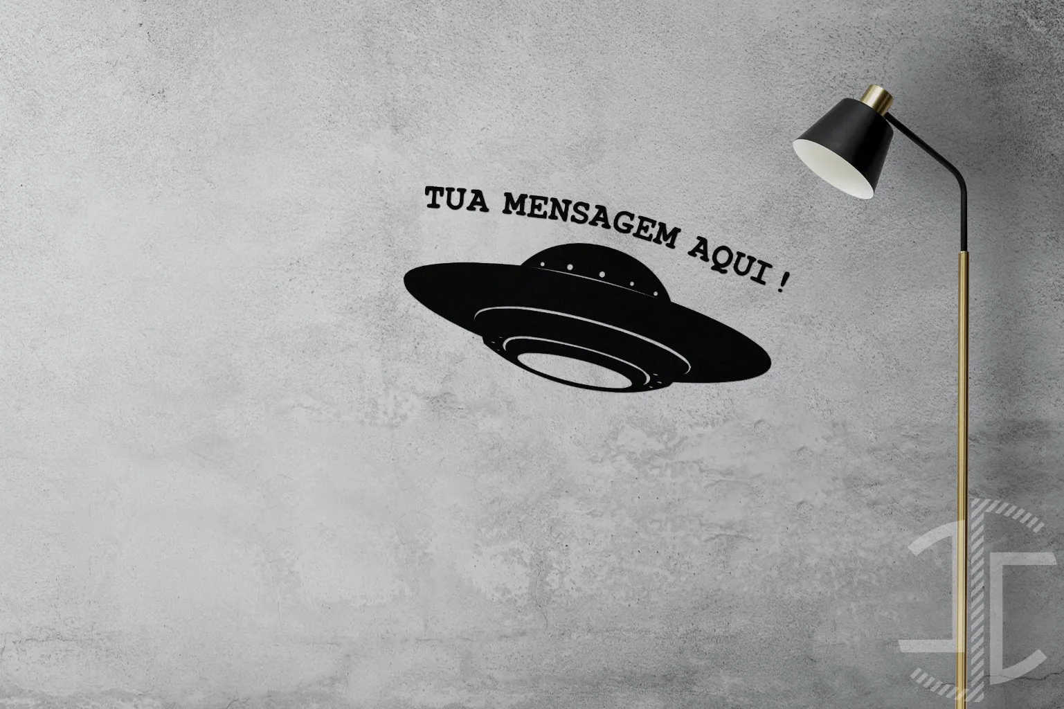 O contraponto a esta presença quase solene é a função que lhe é atribuída: a de ser um veículo para a mensagem do seu proprietário. A frase "Tua Mensagem Aqui!", disposta num arco que acompanha a inclinação da nave e numa tipografia que evoca as máquinas de escrever, transforma este emissário cósmico numa espécie de post-it interestelar. A peça torna-se uma plataforma semiótica, onde o extraordinário — a visita de uma inteligência extraterrestre — é domesticado e posto ao serviço da comunicação terrena. É um convite à ironia, permitindo que a mais banal das frases adquira, por momentos, uma autoridade vinda de outro mundo... :)