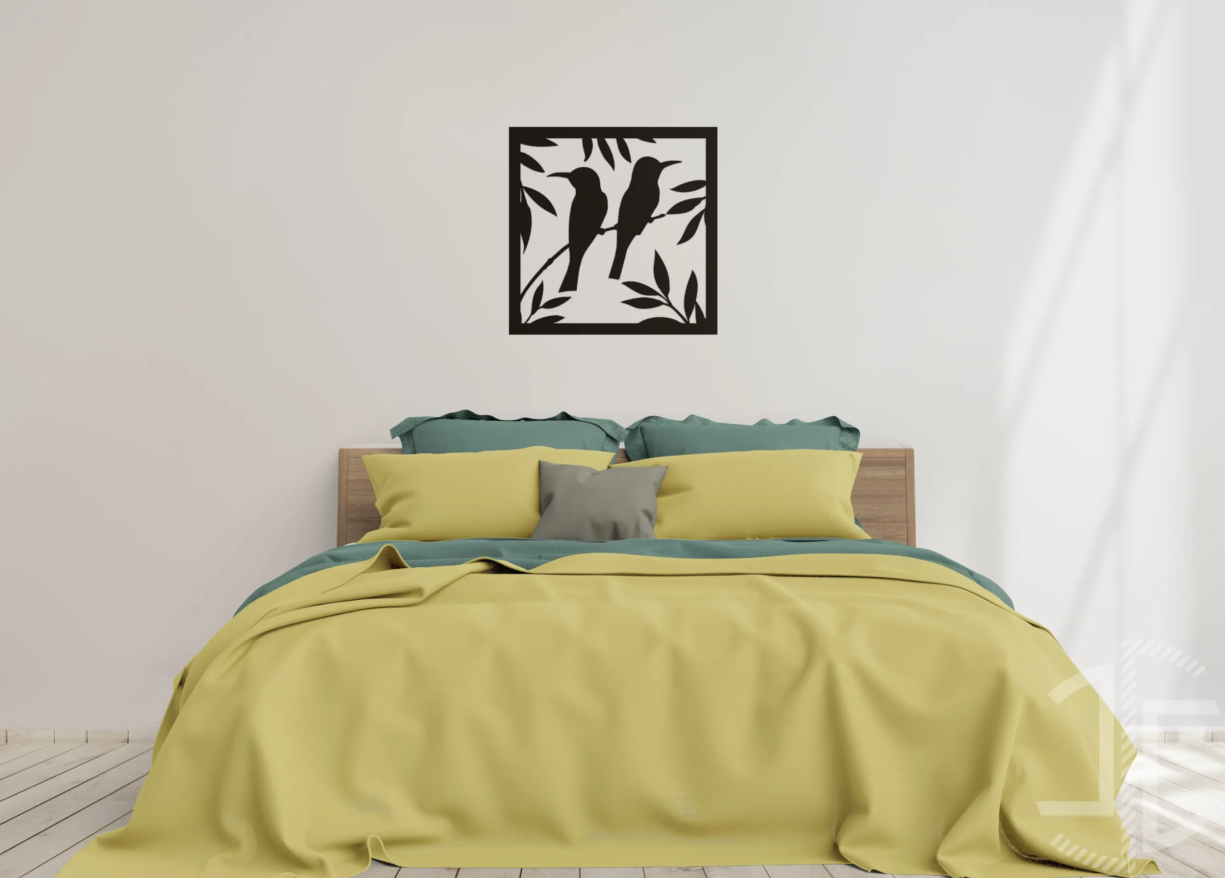 A imagem é uma representação clássica, mas intemporal: dois pássaros repousam lado a lado num ramo de árvore, rodeados por uma delicada folhagem. A silhueta a negro, com as suas linhas limpas e contornos suaves, cria um contraste apelativo com a superfície onde é aplicada, transformando uma parede num quadro de calma e ligação. Os pássaros, neste contexto, simbolizam o amor, a lealdade e a companhia. A sua postura serena e a proximidade no ramo evocam a segurança de um lar partilhado e a quietude que se encontra na presença um do outro. O ramo de árvore, por sua vez, é um símbolo de vida, crescimento e estabilidade, enquanto as folhas representam a vitalidade contínua e a renovação. O enquadramento quadrado oferece uma modernidade geométrica à cena orgânica, sublinhando a beleza da ordem na natureza.