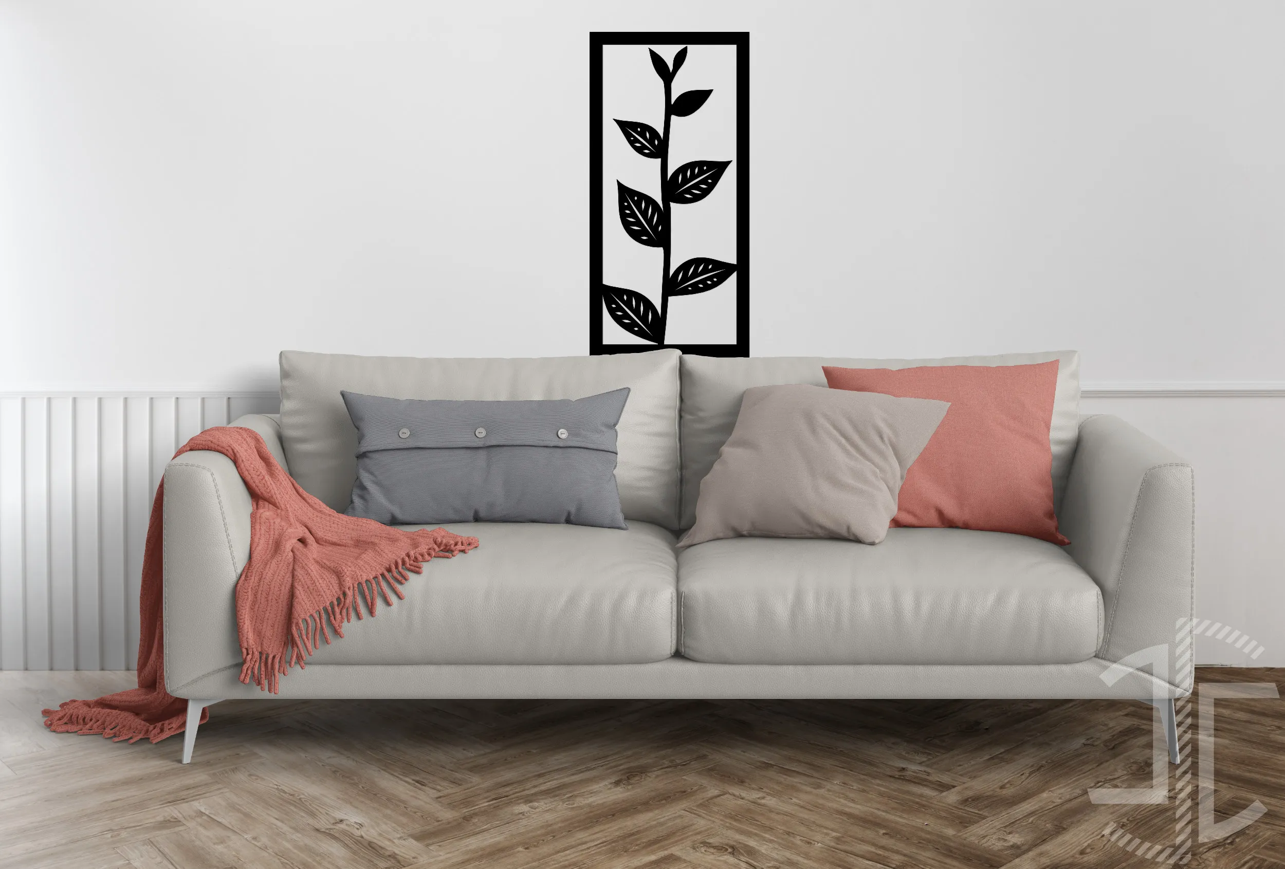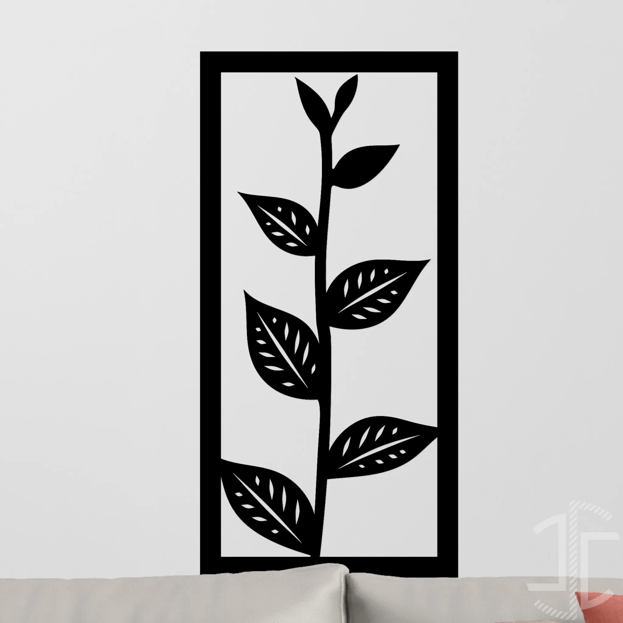 A imagem é composta pela silhueta a negro de um caule ereto, adornado com folhas que se desdobram ao longo da sua extensão, culminando num broto na parte superior. Cada folha é detalhada com pequenas nervuras internas, o que confere profundidade e textura a uma representação que, de outro modo, seria puramente bidimensional. Enquadrado por uma moldura retangular, o design adquire a formalidade de uma obra de arte, ainda que a sua temática remeta para a simplicidade e a organicidade. Esta escolha visual destaca a elegância da forma botânica, transformando-a num elemento decorativo que é simultaneamente moderno e intemporal.