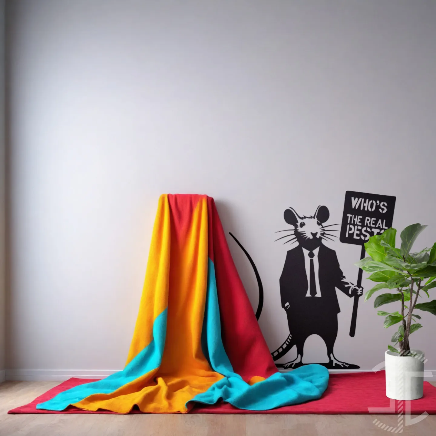 Esta imagem retrata um rato vestido de fato, com um cartaz que pergunta: "Quem é a verdadeira praga?" A questão é uma provocação social, feita com uma boa dose de sarcasmo. Ao vestir o rato como humano, inverte-se o habitual papel de ameaça, questionando se os verdadeiros problemas da sociedade vêm mesmo dos pequenos animais ou não estará na nossa própria espécie, mascarada de respeitabilidade. A ironia está precisamente aí — num mundo onde os maiores estragos vêm, por vezes, dos que parecem mais civilizados.