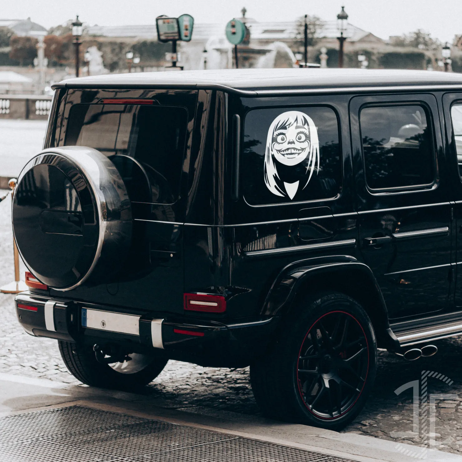 É importante notar a dualidade deste design, pois a arte, tal como uma personalidade complexa, deve adaptar-se ao seu ambiente. Existem duas variantes: uma versão é concebida para superfícies escuras, como o vidro fumado de um carro, onde o vinil branco recorta a figura, brilhando na escuridão como um farol de loucura amigável. A outra é otimizada para fundos claros, como um portátil prateado ou uma parede pálida. Neste caso, o vinil (preto) delineia os contornos e as sombras, utilizando a própria superfície como o "branco" do rosto. A escolha é sua, dependendo de onde pretende que este adorável semblante espalhe a sua... simpatia..