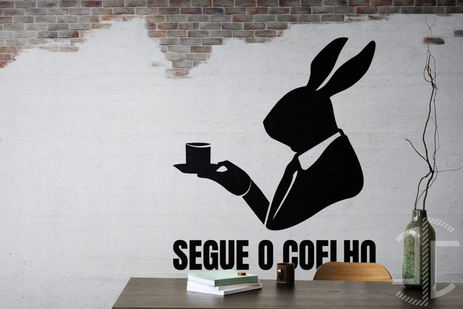 Este decalque monocromático, "Segue o Coelho", é uma peça de design que opera como um convite à introspeção e à subversão da realidade percebida. O centro da composição é dominado pela silhueta de um coelho antropomórfico, elegantemente envergando um casaco e gravata, uma clara alusão ao célebre Coelho Branco de "Alice no País das Maravilhas". Contudo, a sua postura, com uma das patas estendida a oferecer uma pequena chávena, quase que remete de forma ainda mais direta para o enigmático "follow the white rabbit" do filme "The Matrix"..