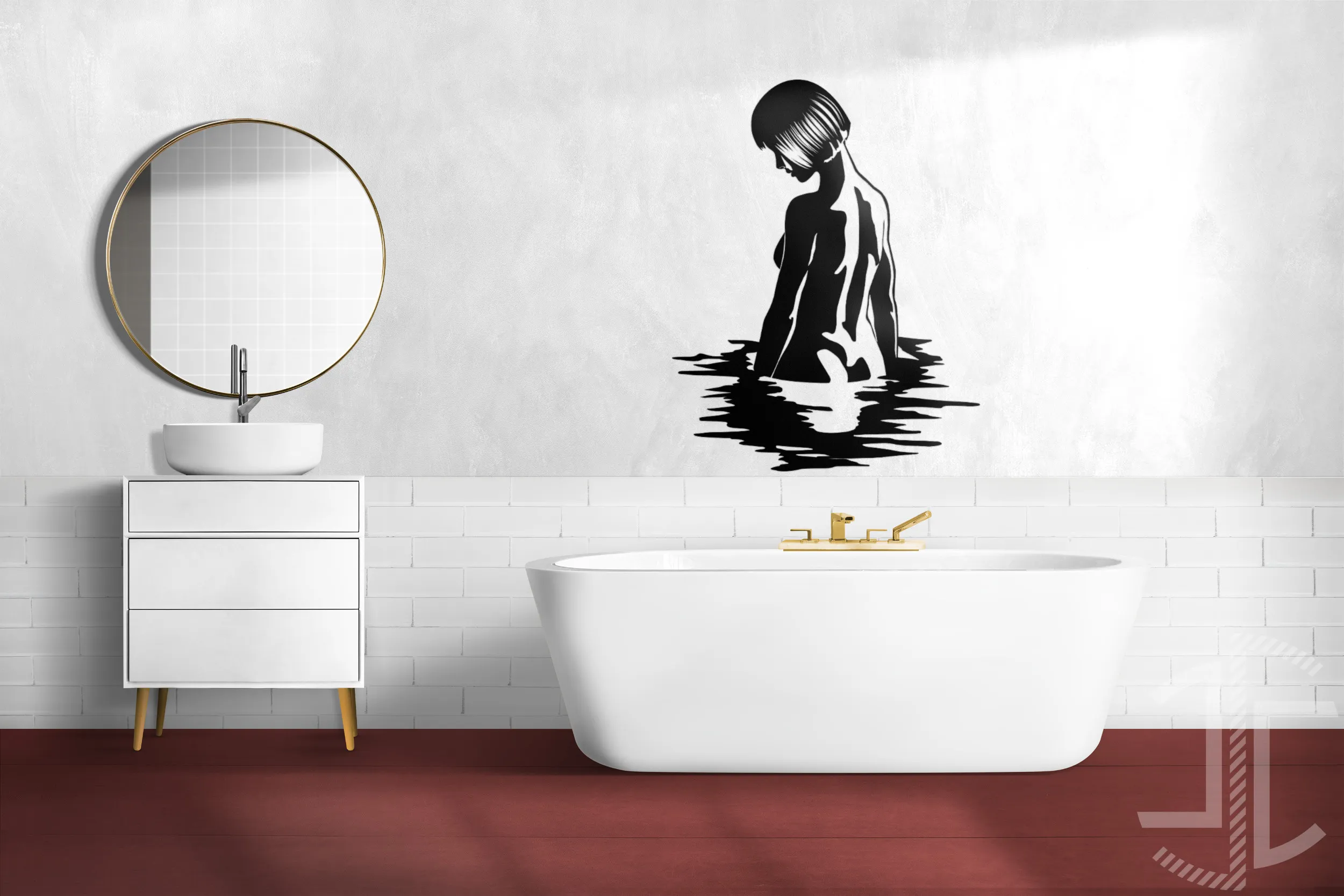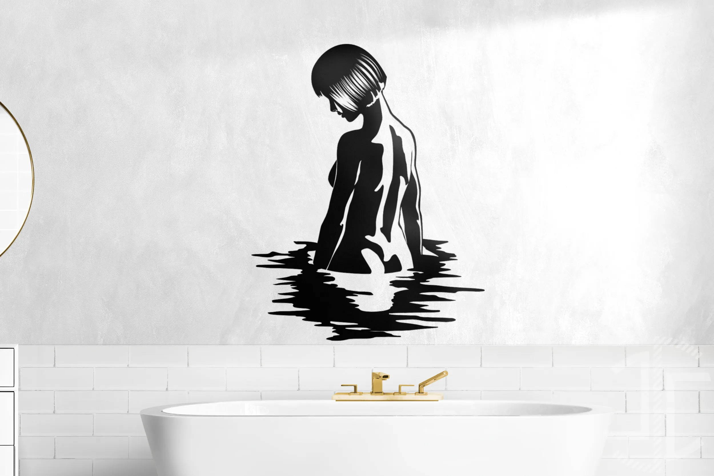 Este autocolante em vinil apresenta a figura feminina em toda a sua elegância e mistério, imersa parcialmente em água. O contraste da silhueta negra sobre uma superfície clara produz um efeito visual poderoso e sereno, que remete à contemplação, introspecção e beleza natural.